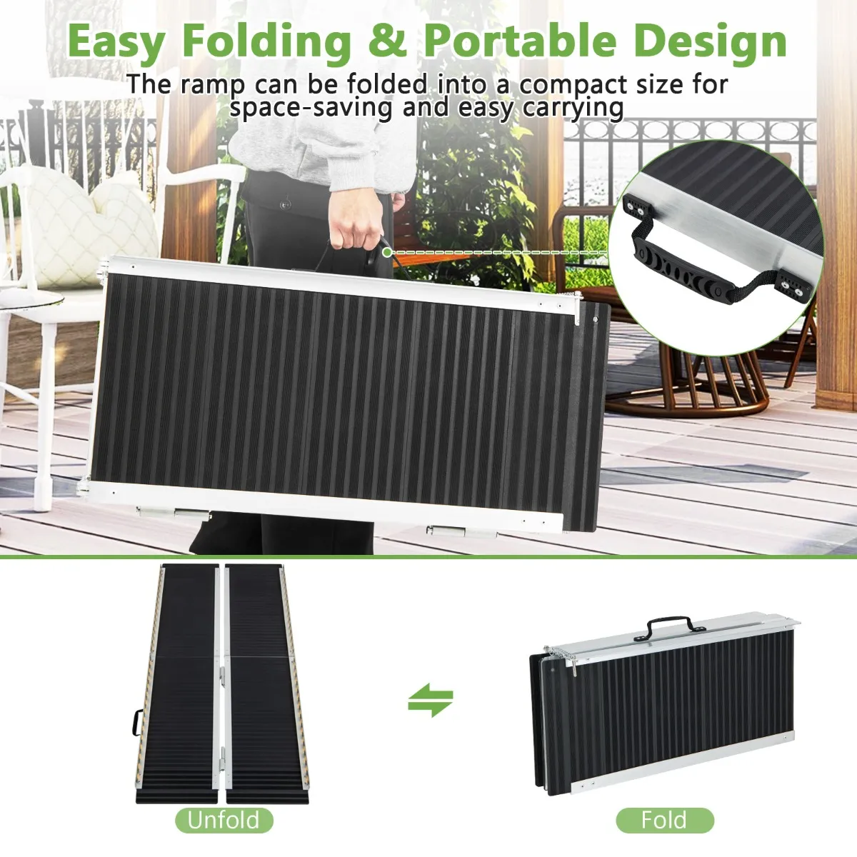 Opvouwbaar en draagbaar ontwerp: Dankzij de easy-fold functie kan de oprijplaat worden opgevouwen tot een compact formaat voor ruimtebesparing en eenvoudig transport. Neem hem overal mee naartoe en zorg voor toegankelijkheid waar je hem nodig hebt.