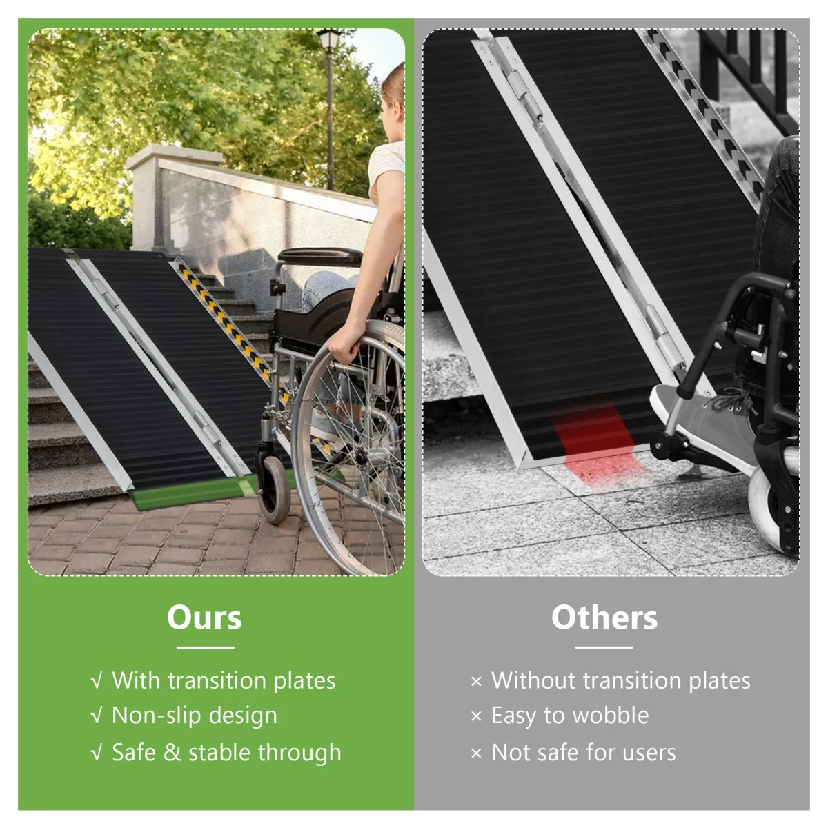 Veiliger ontwerp: Deze draagbare drempeloprijplaat is zorgvuldig ontworpen met reflecterende waarschuwingsstickers aan beide zijden, voor maximale zichtbaarheid om het risico op vallen te minimaliseren. Bovendien zorgen veiligheidspennen en stabiele scharnieren voor extra duurzaamheid.