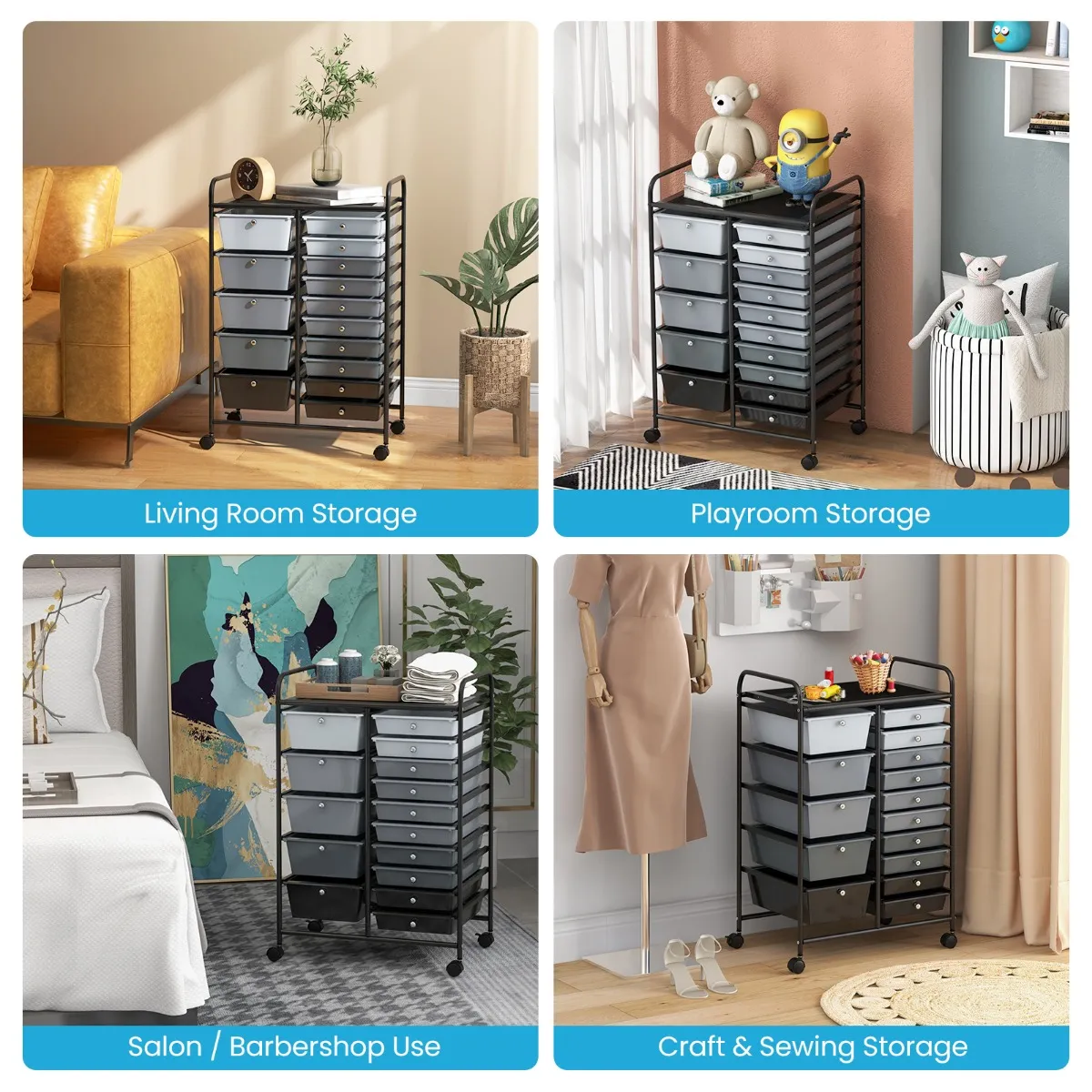 In de badkamer voor cosmetica en handdoeken, bij de kapper voor krulspelden, haarspelden en -borstels enz. maar ook op kantoor voor schrijfgerei, paperclips, enveloppen en nog veel meer. Met zijn 15 schuifladen van kunststof en een legplank biedt de rolcontainer voldoende ruimte om je spullen op te bergen. Door de 4 wielen is de trolley zeer beweegbaar en kan hij in elke hoek worden geplaatst.