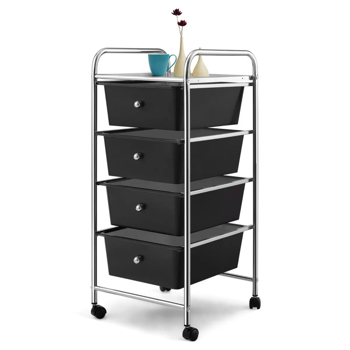Het verticale ontwerp met 4 lades van onze rollade-opbergwagen neemt minder ruimte in beslag en biedt aparte opbergruimte voor meer spullen, zodat je verschillende spullen georganiseerd kunt opbergen. Bovendien is elke lade uitneembaar voor eenvoudig schoonmaken en installeren. Bovendien kunnen de 2 rails aan de zijkant van de multifunctionele ladewagen gebruikt worden als duwhandgrepen. Bovendien heeft onze trolley met 4 lades 4 wielen, waarvan 2 vergrendelbaar voor een soepele en stabiele verplaatsing. Dus of je hem nu in de slaapkamer, keuken of op kantoor wilt gebruiken, onze trolley met meerdere niveaus biedt comfort en voegt een vleugje stijl toe aan je ruimte. Bovendien is het frame van de ladewagen gemaakt van roestvrij metaal voor extra stabiliteit en duurzaamheid. En de lades zijn gemaakt van waterdicht, scheurbestendig PP dat lang meegaat.Het verticale ontwerp met 4 lades van onze rollade-opbergwagen neemt minder ruimte in beslag en biedt aparte opslag voor meer items, zodat je verschillende items georganiseerd kunt opbergen. Bovendien is elke lade uitneembaar voor eenvoudig schoonmaken en installeren. Bovendien kunnen de 2 rails aan de zijkant van de multifunctionele ladewagen gebruikt worden als duwhandgrepen. Bovendien is onze trolley met 4 lades uitgerust met 4 wielen, waarvan 2 vergrendelbaar voor een soepele rit.