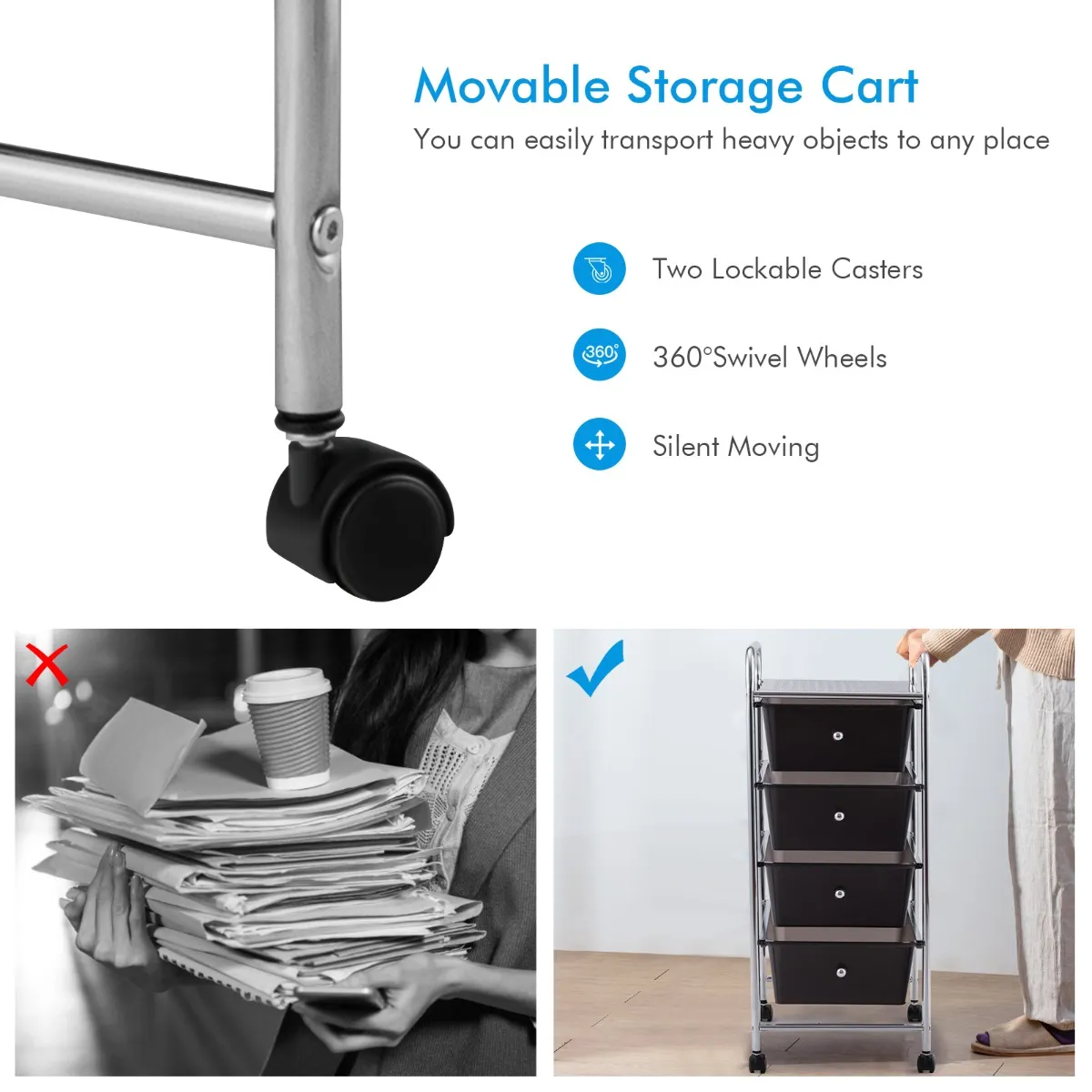 【Flexibiliteit en mobiliteit】Vier universele wielen zijn 360 graden draaibaar en vergemakkelijken het verplaatsen van de wagen. Bovendien zorgt het ontwerp met vergrendelbare rem voor stabiliteit als je wilt dat de wagen op een bepaalde plaats blijft.