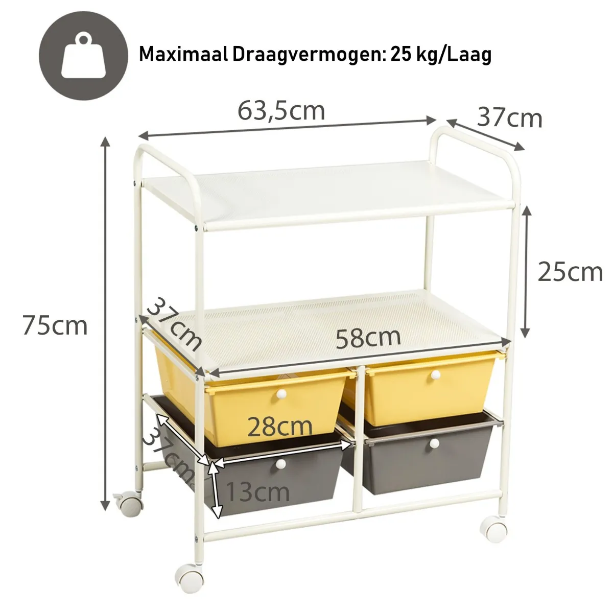 Het is ideaal om uw werk- en leefruimte gemakkelijk in uw kantoor, huis, school, garage of waar dan ook organisatie te krijgen. Deze trolley met 4 laden en 2 planken is gemaakt van een frame met een frame van chroomstaal en een plastic lade, is duurzaam en zal u lang van dienst zijn. Vier universele wielen helpen je hem gemakkelijk te verplaatsen. Aarzel niet om er een te kopen!