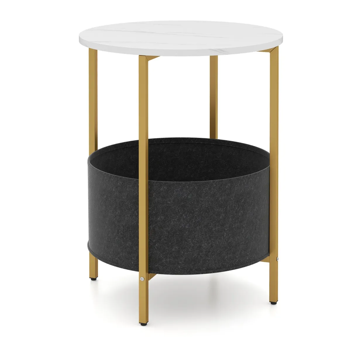 De veelzijdige bijzettafel heeft een ruim rond blad van 44 cm en een verwijderbare vilten mand eronder voor opslag. Ondersteund door een stevig metalen frame met een X-voet en verstelbare glijders kan hij tot 30 kg dragen. Dankzij het multifunctionele ontwerp kan hij worden gebruikt als salontafel, nachtkastje of decoratieve bijzettafel. Niet alleen verfraait deze tafel de inrichting van je huis, maar de elegante, ruimtebesparende constructie past perfect in elke kamer.