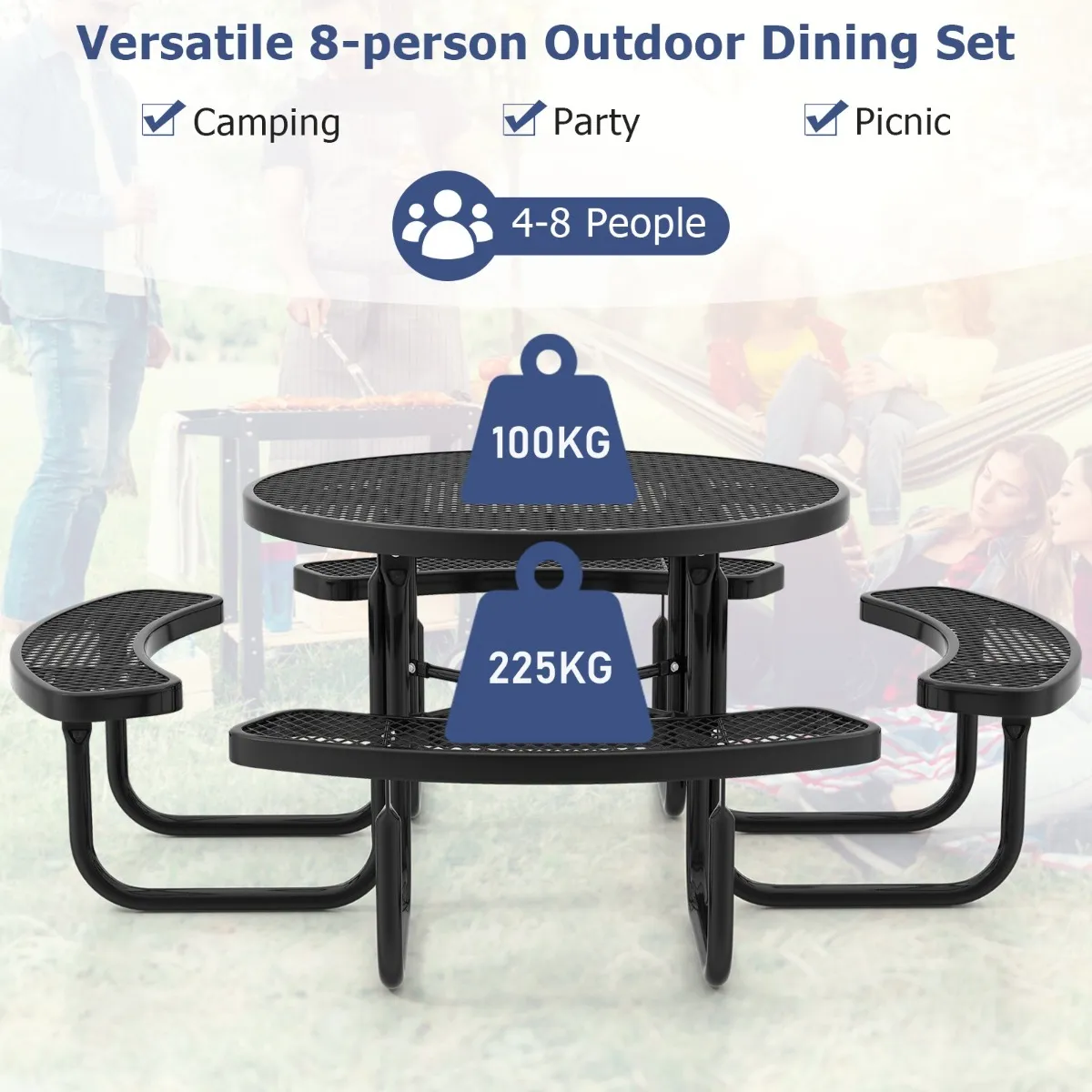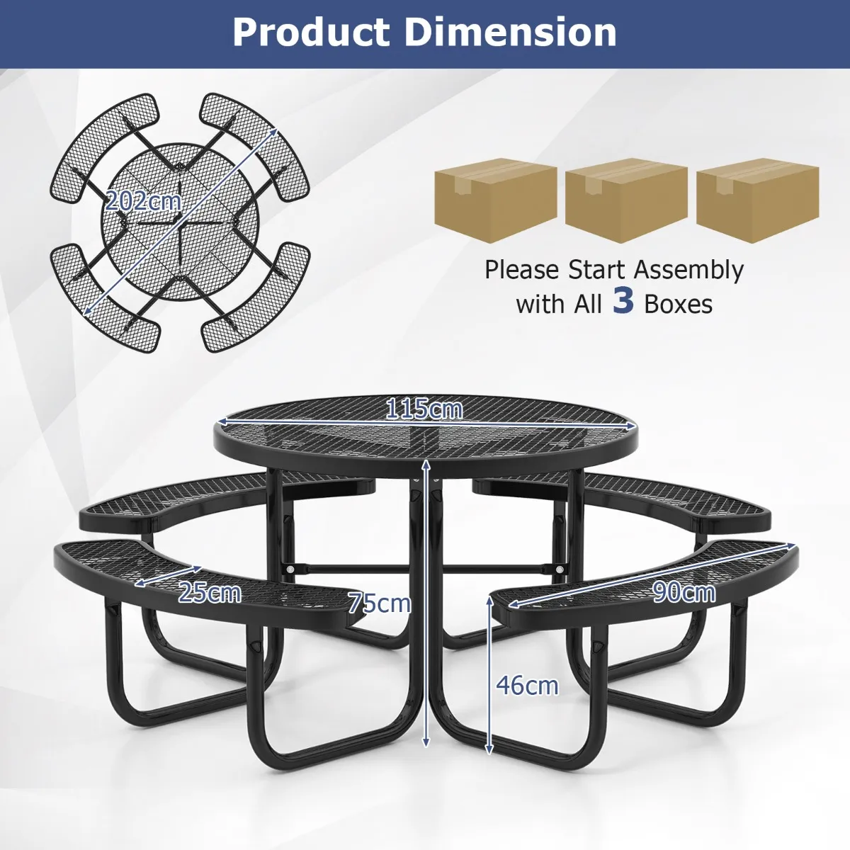 【Eetgelegenheid voor 8】: De 115 cm ronde picknicktafel met 4 gebogen banken is ontworpen om een gezellige ruimte te creëren waar 8 mensen comfortabel kunnen zitten en van elkaars gezelschap kunnen genieten.