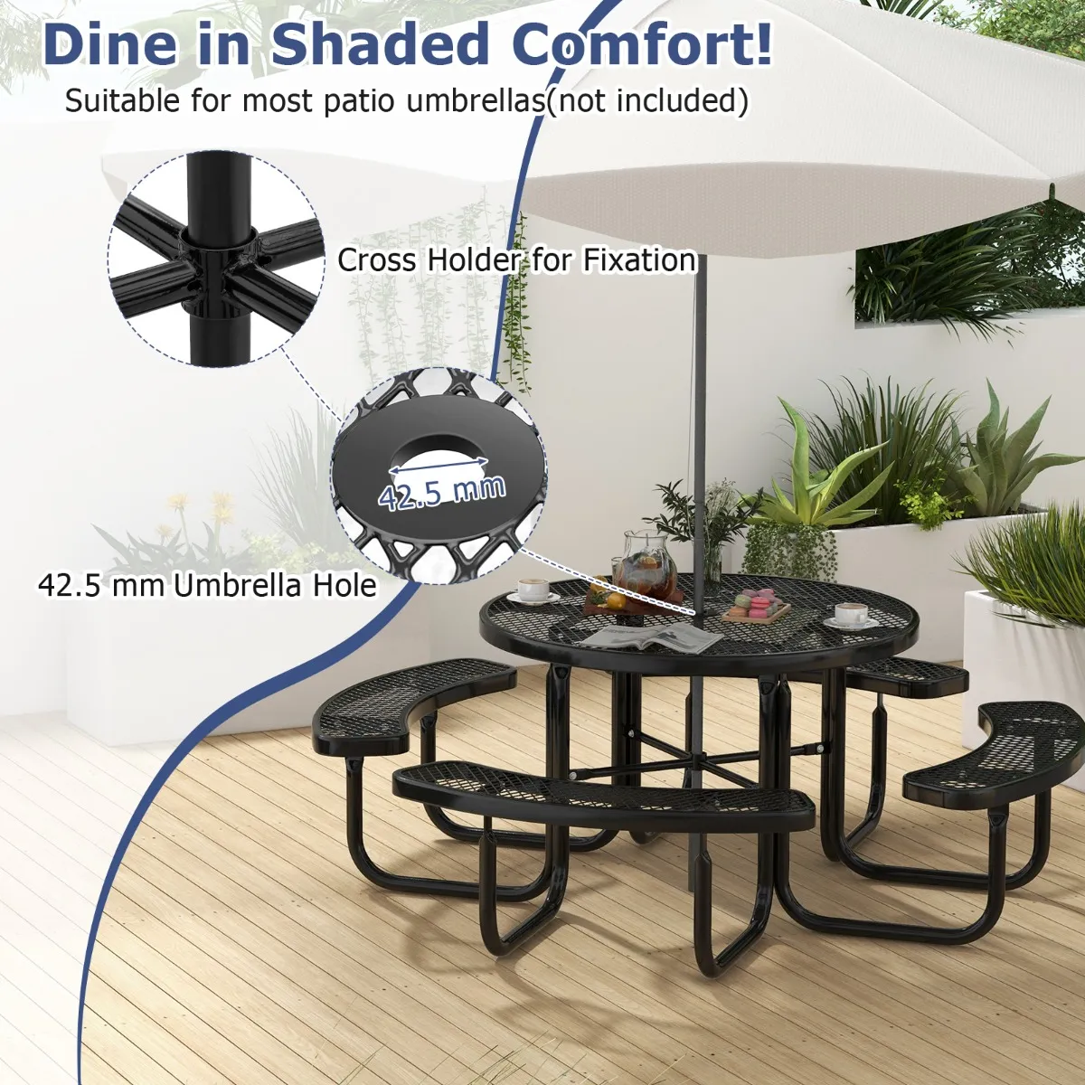 Vierkante Picknicktafel Set Met 4 Ingebouwde Banken Metalen Campingtafel Met Zitplaatsen En Gat Voor Parasol Voor Zwembadtuin Zwart
