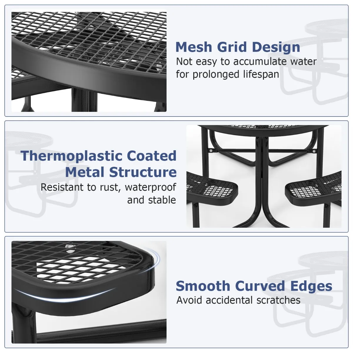 Geniet van meer plezierige eetmomenten in de buitenlucht met de stevige picknicktafel! De ronde picknicktafelset wordt geleverd met 4 banken, die genoeg zitplaatsen bieden voor maximaal 8 personen. De kampeertafelset is gemaakt van een stevig gecoat metalen frame en is ontworpen om alle weersomstandigheden te weerstaan, zodat hij lang meegaat voor gebruik buitenshuis. Uitgerust met een parasolgat en dwarssteun past de commerciële buitentafel op de meeste terrasparasols (niet inbegrepen).