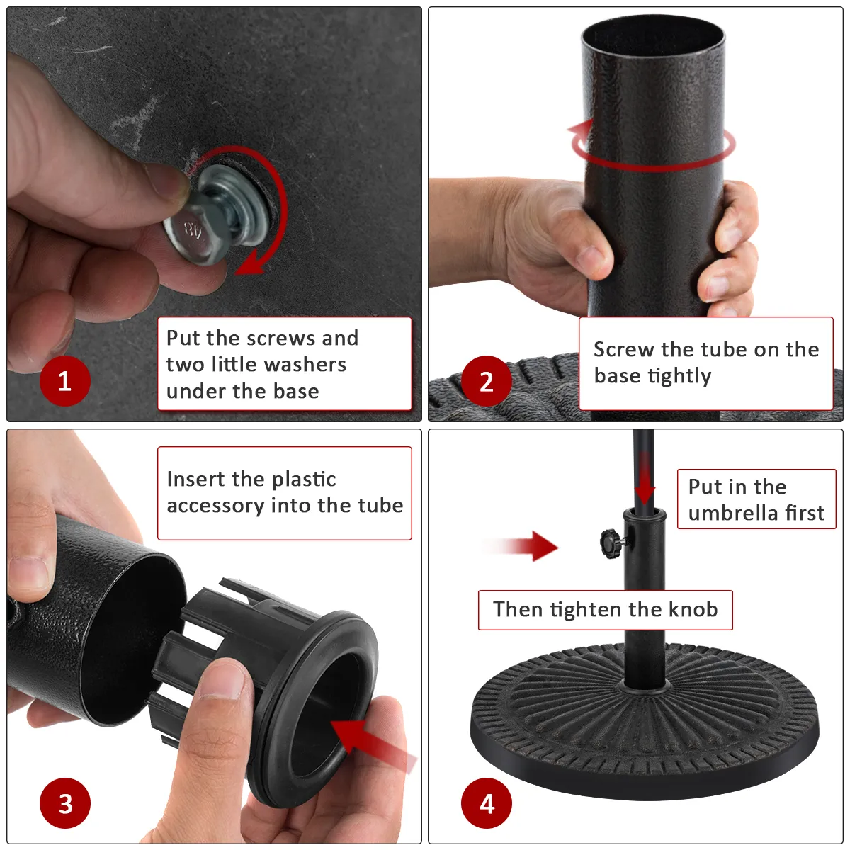 【Handvaste knop】De paraplubak heeft een handvaste knop om de parasol aan de basis te bevestigen. En aan de bovenkant van de ijzeren buis zit een koppeling waarmee 38mm en 48mm parasolstokken gemonteerd kunnen worden. Voordat u de steel erin steekt, draait u de knop op de maximale diameter, d.w.z. passend bij de diameter van uw paraplu.