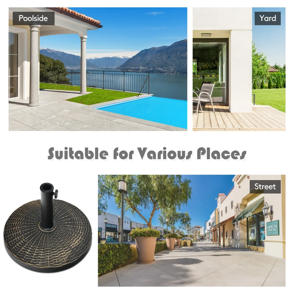 Hoogwaardig harsmateriaal:Â Deze ronde parasolvoet is gemaakt van geselecteerde hars, die opmerkelijke prestaties levert bij hoge temperaturen, zonlicht en verouderingsbestendigheid. Door de hoge kwaliteit is deze basis zeer geschikt voor buitengebruik en zal hij u jaar na jaar goed van pas komen.