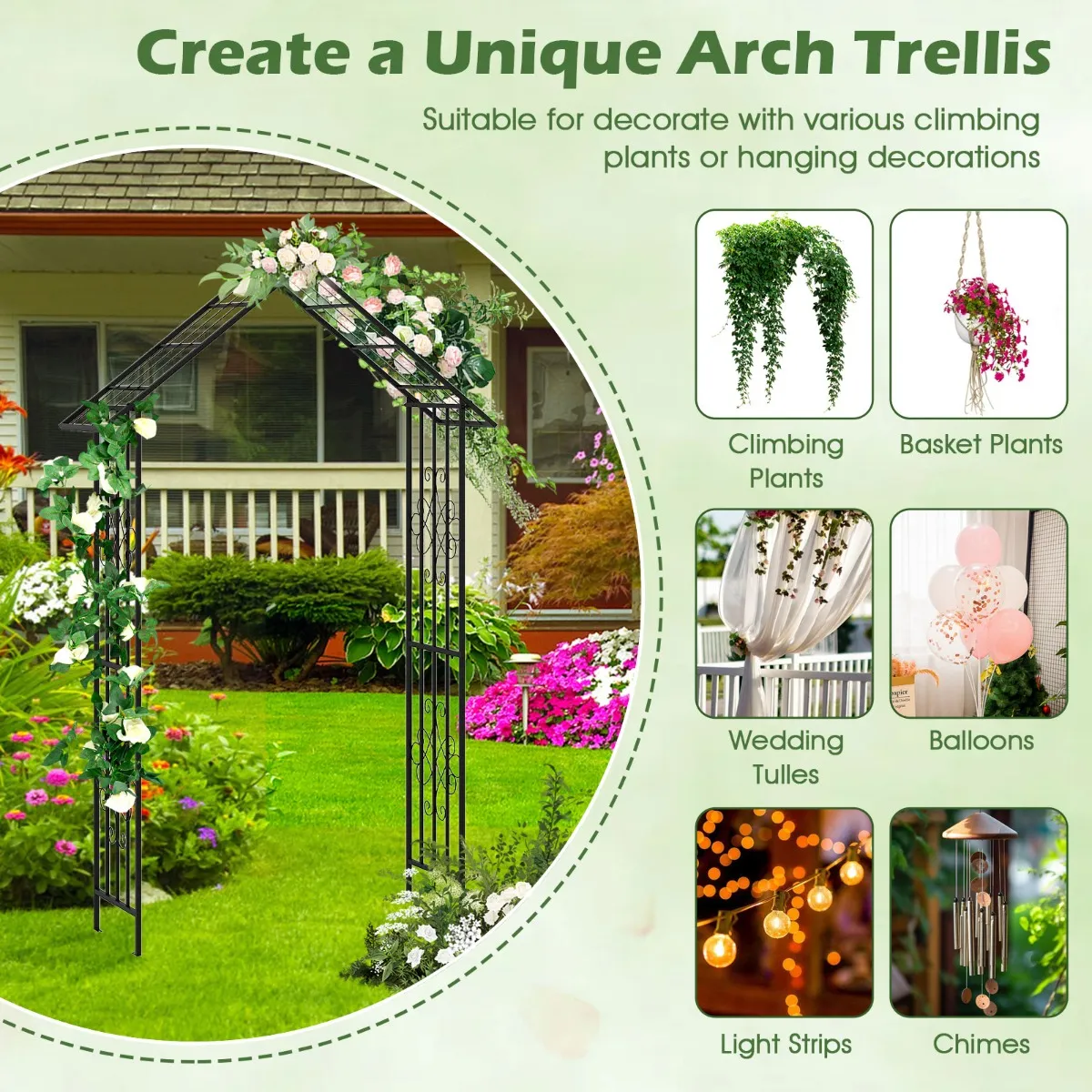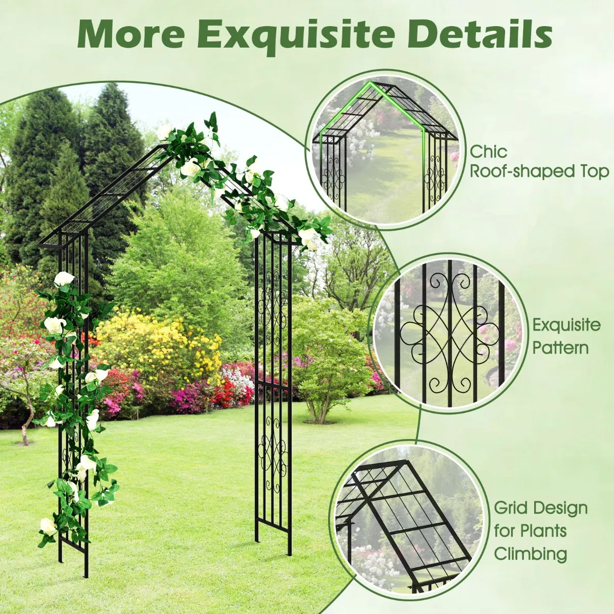 Zoek je een moderne en stijlvolle touch voor je buitenruimte? Dit tuinprieel heeft delicate lijnen en een chique dakvormige kant die je buitendecoratie elegantie geeft. Met meerdere zijdelingse dwarsstangen biedt deze latpergola voldoende ruimte voor je creativiteit. Of het nu voor de presentatie van planten, verlichting, ballonnen of bloemen is, je kunt je eigen prieel voor bijna elke gelegenheid ontwerpen. Bovendien is deze tuinboog van metaal perfect geschikt als pergola, bruiloftsboog of achtergrondachtergrond. Deze van robuuste materialen met versterkte verbindingen gemaakte boog biedt duurzaamheid en stabiliteit. Daarom is ons product precies wat je zoekt.