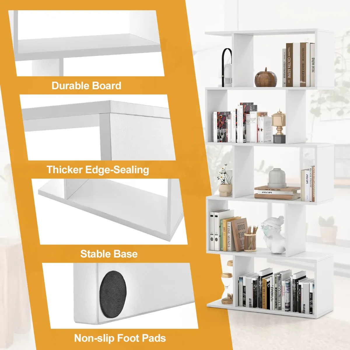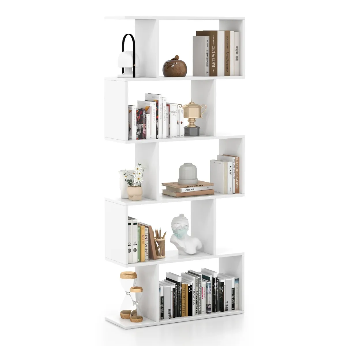 Verfraai de look van je huis met deze geometrische kast. De open legplanken met 5 etages bieden je ideale opbergruimte om alledaagse spullen netjes op te bergen. Het unieke S-vormige ontwerp past harmonieus in het interieur. Het is zeer aanpasbaar en doet perfect dienst als boekenkast, displayplank of roomdivider in je huis of kantoor. Voor een betrouwbare structuur kun je hem aan de muur bevestigen om schommelen te voorkomen en de veiligheid te verbeteren.