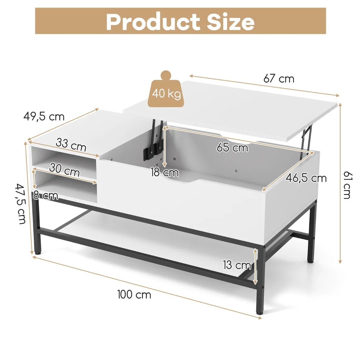 Transformeer je woonkamer met de functionele tafel. Met een opklapbaar bovenblad transformeert de tafel moeiteloos van een standaard salontafel naar een verhoogde tafel. Hij heeft verborgen opbergruimte en een onderste plank die extra ruimte bieden voor boeken en decoratieve voorwerpen. De verwijderbare plank zorgt voor nog meer ruimte. Het stevige metalen frame gaat lang mee, terwijl de verstelbare voetsteunen de tafel stabiel houden op oneffen oppervlakken. Hij is ontworpen om perfect te passen in elk interieur.