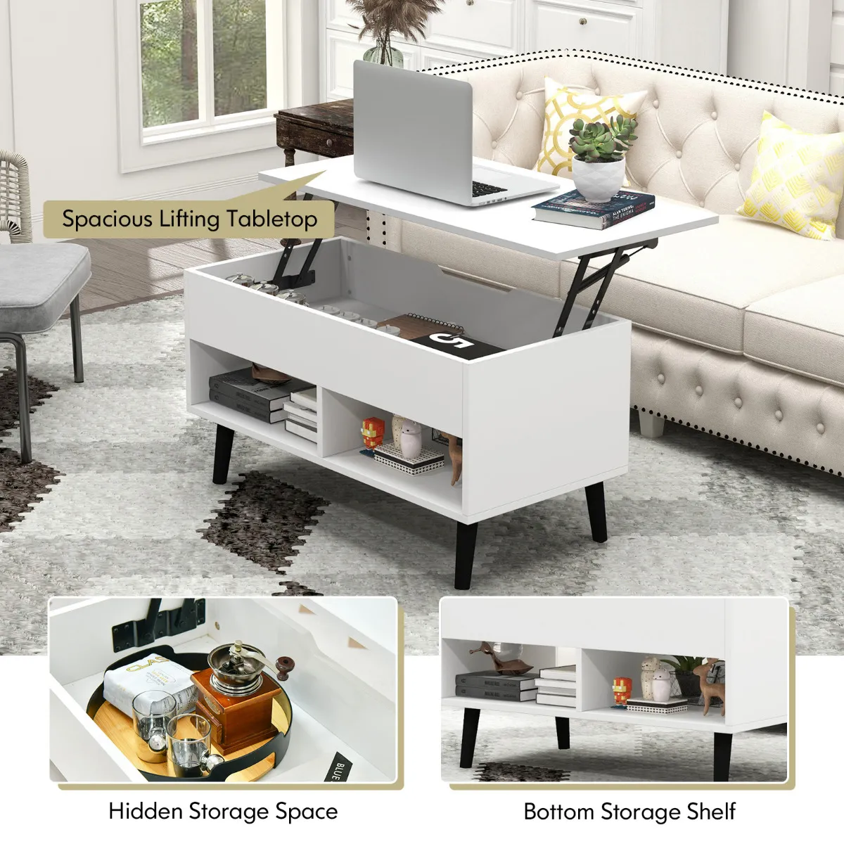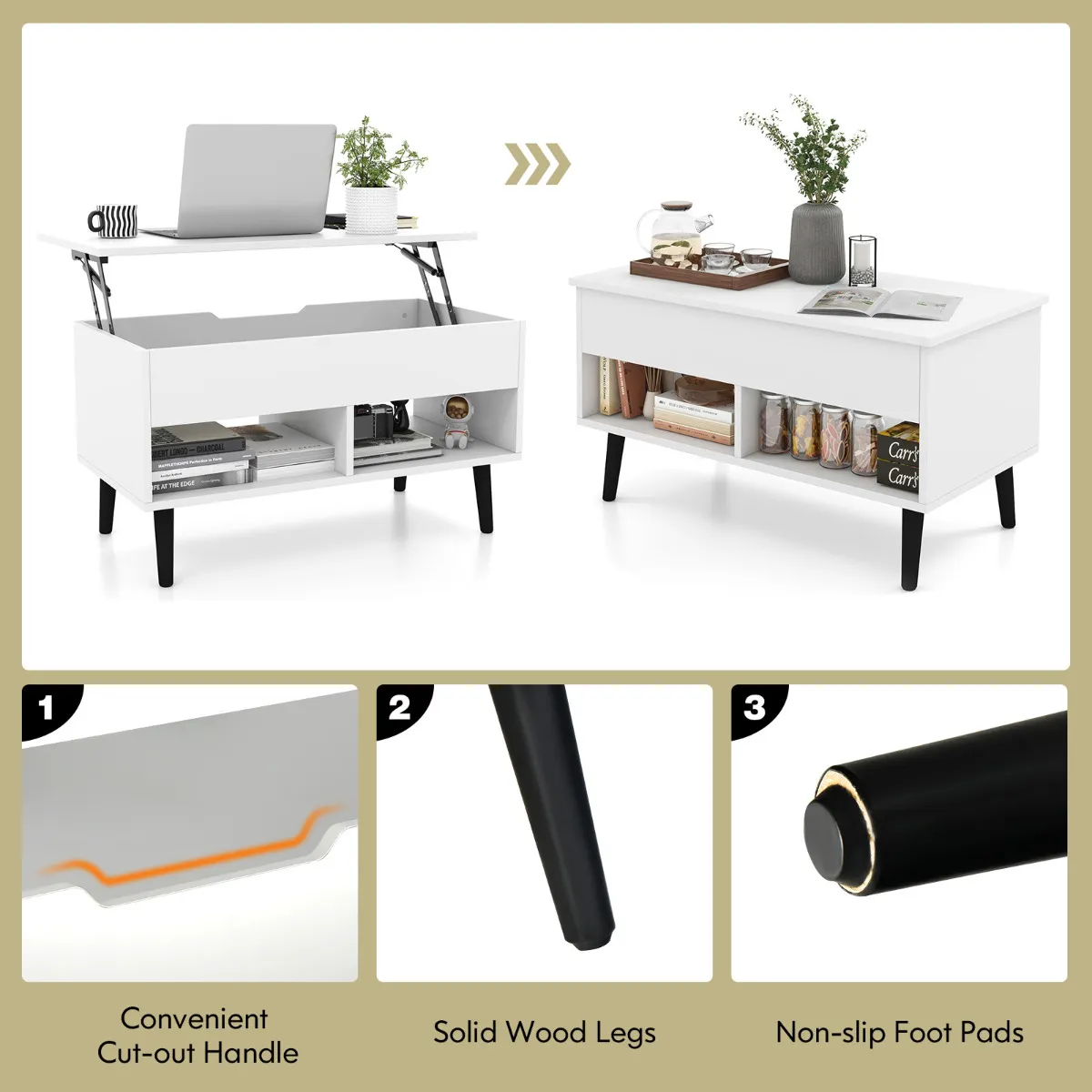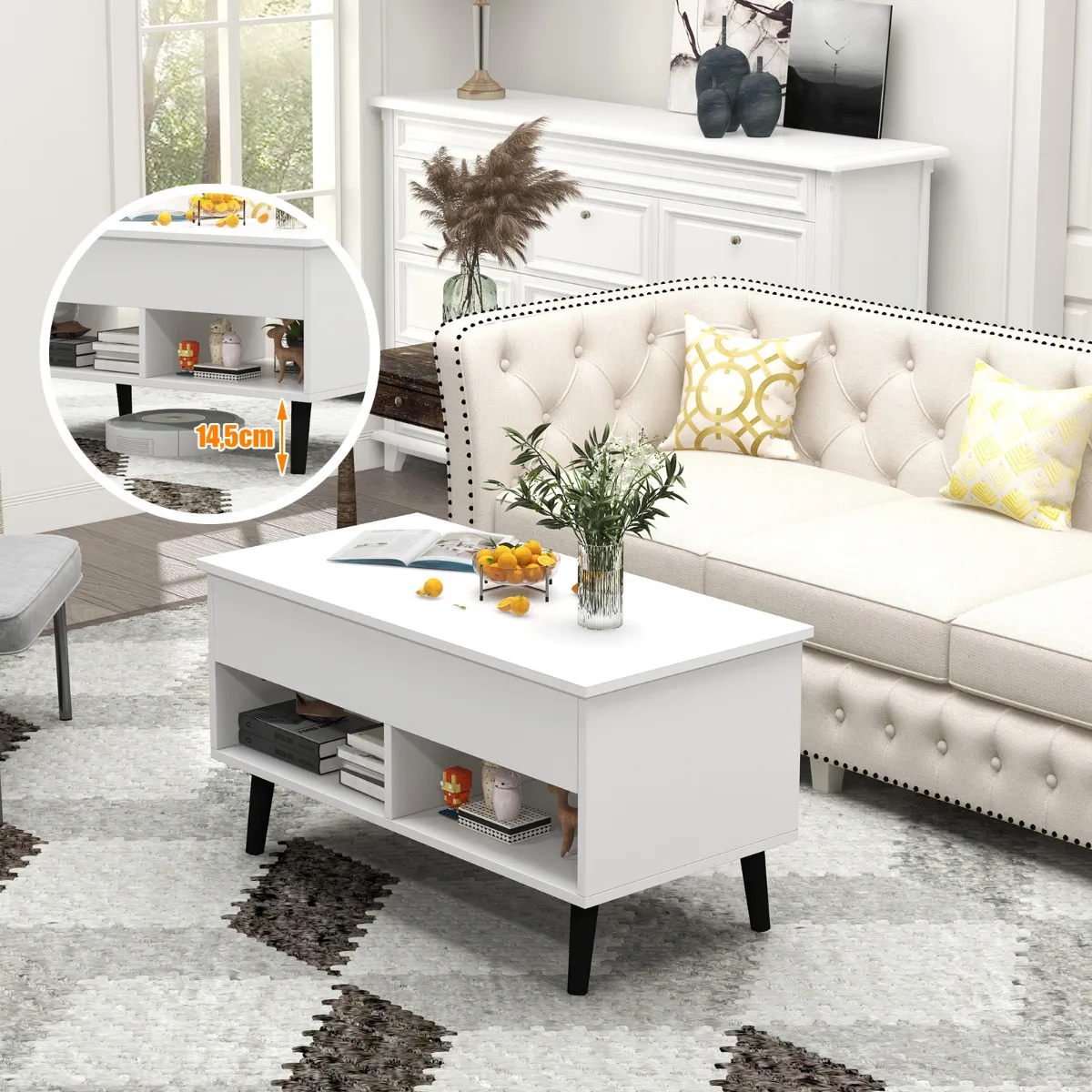 Betrouwbare constructie: De salontafel met hefblad is een solide en goed gemaakt stuk. Gemaakt van dik technisch hout en MDF, is deze centertafel stevig genoeg om in totaal tot 60 kg te dragen. De massief houten poten bieden ook betrouwbare ondersteuning en de antislip voetpads beschermen de vloer tegen krassen.