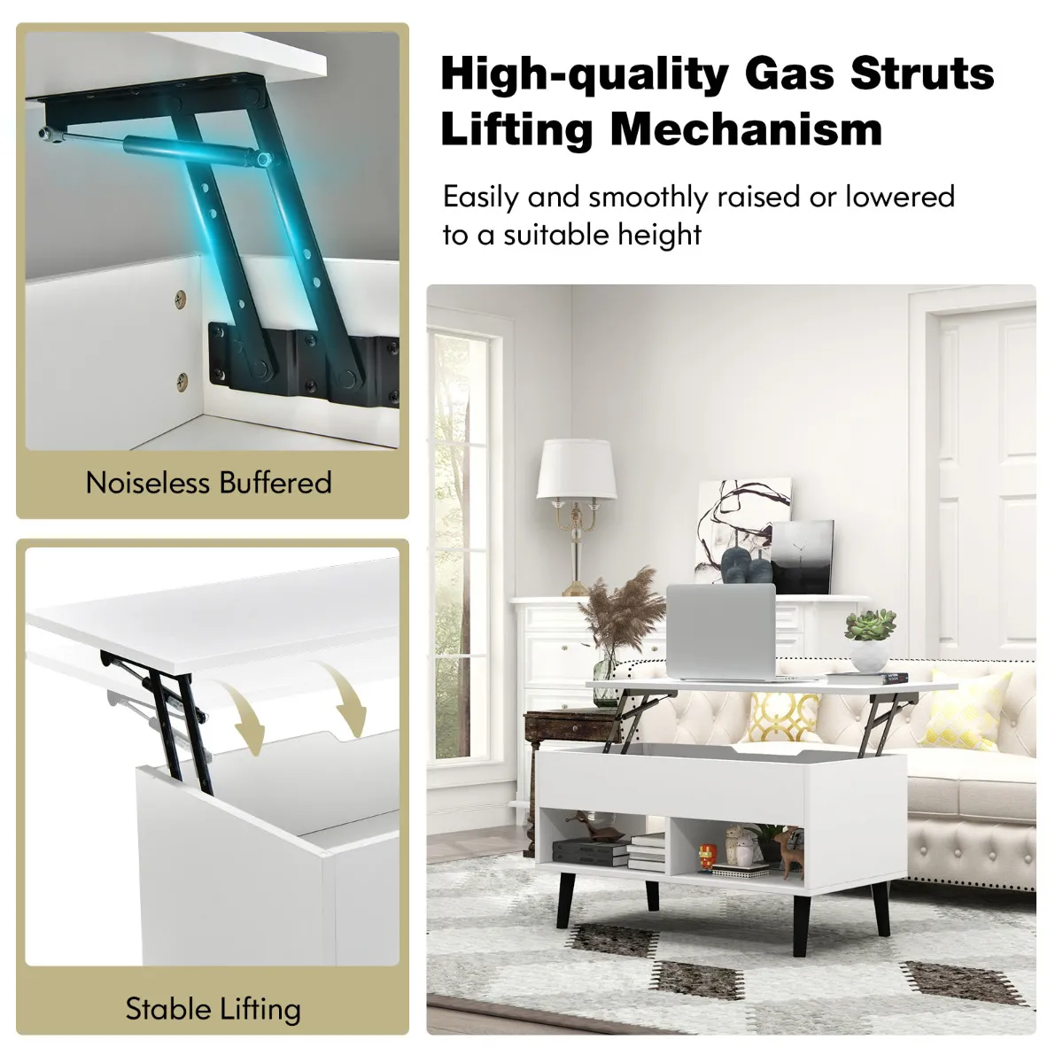 Verbeter de esthetiek van uw huis met deze moderne salontafel. Of u nu een plek nodig heeft om te studeren of gewoon lekker te eten, hij voldoet aan uw behoeften. Het metalen hefmechanisme met veer maakt het gemakkelijk om het tafelblad omhoog en omlaag te brengen, zodat u een handig bureau of cocktailtafel hebt. Met een groot verborgen vak en 2 open planken biedt de salontafel veel opbergruimte voor uw dagelijkse gebruiksvoorwerpen om meer tafelruimte te creëren. Dankzij de stevige structuur hoeft u zich geen zorgen te maken over het draagvermogen en de betrouwbaarheid. Haal deze salontafel in huis die het perfecte evenwicht vindt tussen functionaliteit en stijlvol design.