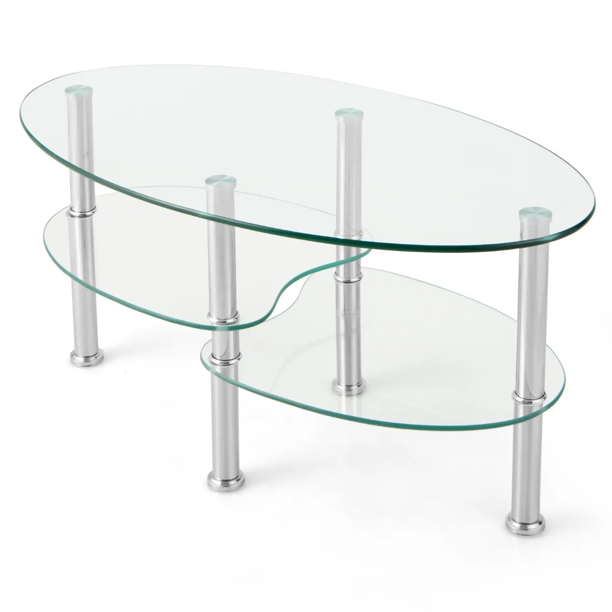 Deze glazen tafel is geconstrueerd met de beste kwaliteitsmaterialen zoals gehard glas en staal. De unieke mix van metaal en glas transformeert dit kunstwerk in een moderne theetafel. Het ovale bureaublad en de gebogen onderplanken verhogen de aantrekkelijkheid van deze tafel en maken hem tot het middelpunt van de belangstelling in uw woonkamer. Ook deze salontafel heeft een hoge gebruikswaarde. Het ruime tafelblad en de open opberg vakken maken uw spullen op orde. Bovendien zorgen dikke glazen schappen en een stevige verbinding voor de stabiliteit en de belastbaarheid van de tafel.