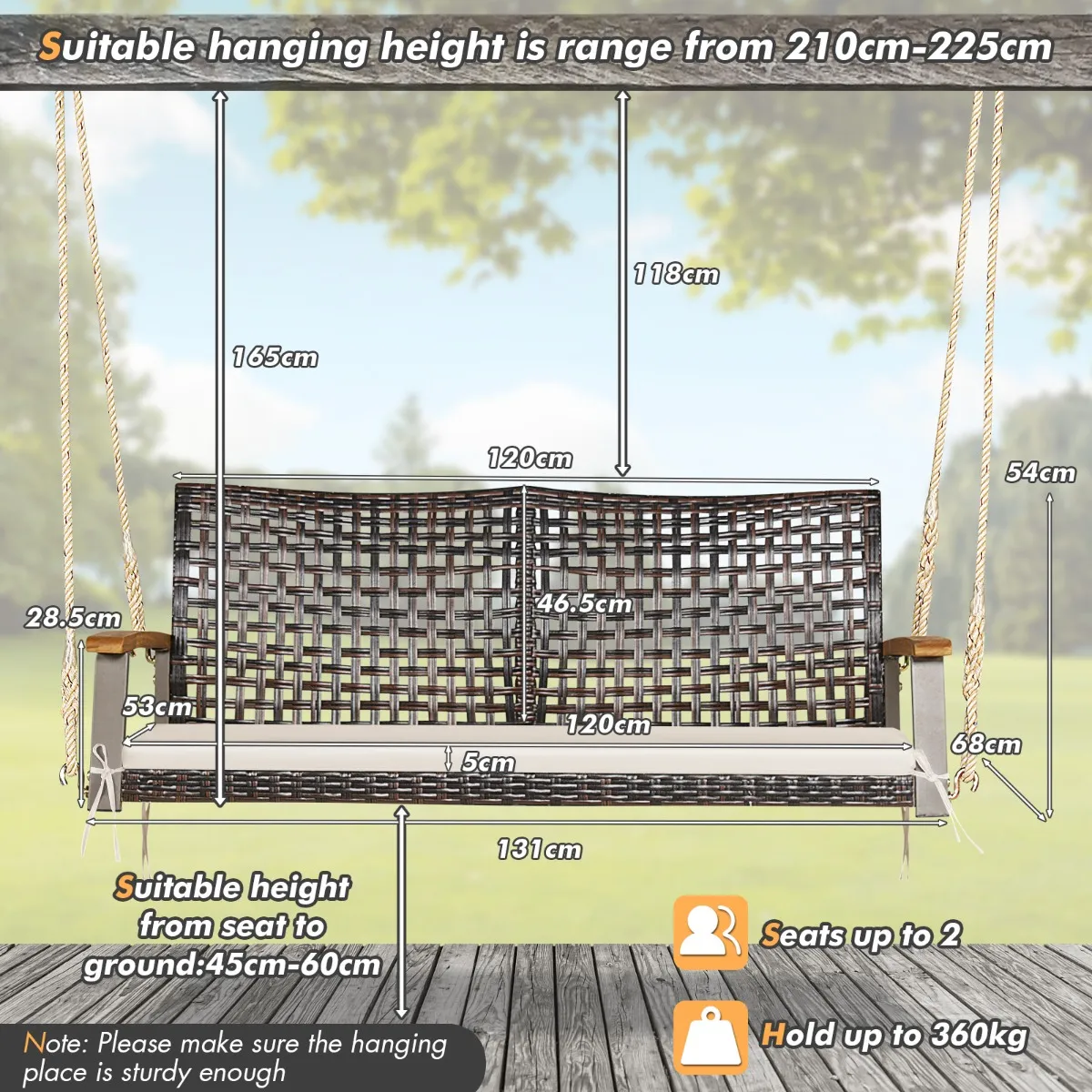 Veilige schommelen: Deze schommelstoel bevat twee 3 m lange ophangkabels en versterkte schroefhaken, zodat je hem stabiel kunt ophangen. (Opmerking: zorg ervoor dat de ophangplaats stabiel genoeg is.) Hij kan tot 360 kg dragen. Met een elegante uitstraling is de schommelstoel perfect voor verschillende gelegenheden zoals de veranda, de achtertuin en de tuin.