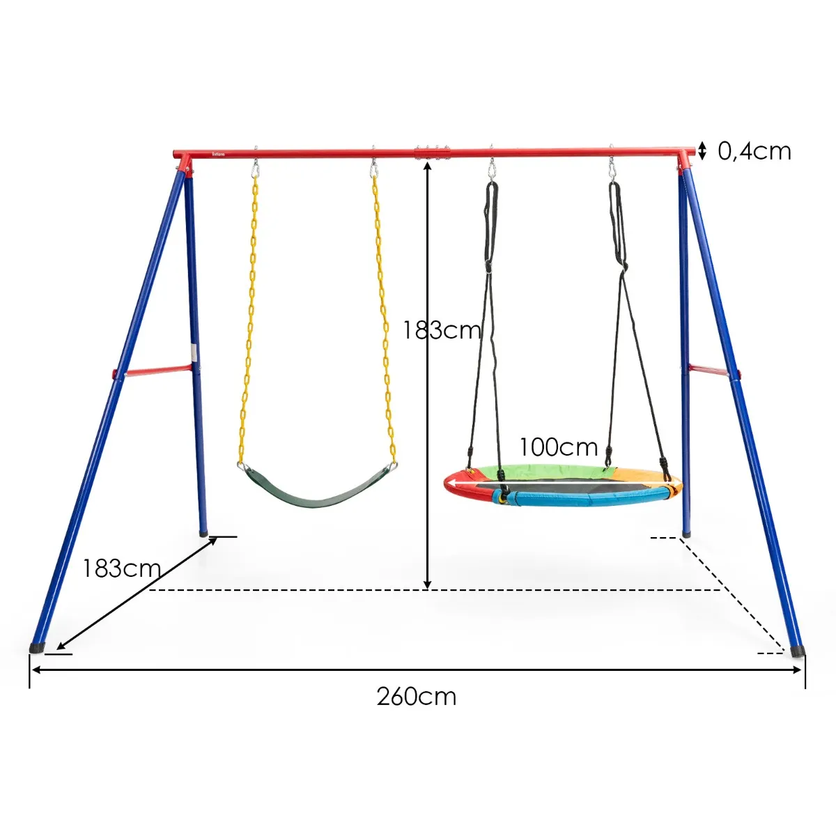 Ruim speelbereik: Ons schommelframe biedt veel ruimte om te spelen en maakt het kinderen mogelijk om vrij te schommelen en met volle teugen van hun speeltijd te genieten. Geef ze de ruimte die ze buiten nodig hebben voor eindeloos plezier. De totale afmetingen bedragen 260 x 183 x 183 cm.