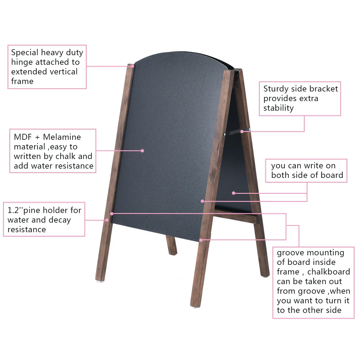 Ons dubbelzijdig A-frame stoepbord is geschikt voor zowel binnen- als buitengebruik. Het is ideaal voor het weergeven van een menu of het afleveren van reclameboodschappen in uw winkel, kroeg of café. Dankzij de hoogwaardige afwerking is het oppervlak zeer robuust, slijtvast en eenvoudig te reinigen. Bovendien zijn twee panelen verbonden met scharnieren, wat zeer stabiel is en snel kan worden opgevouwen.