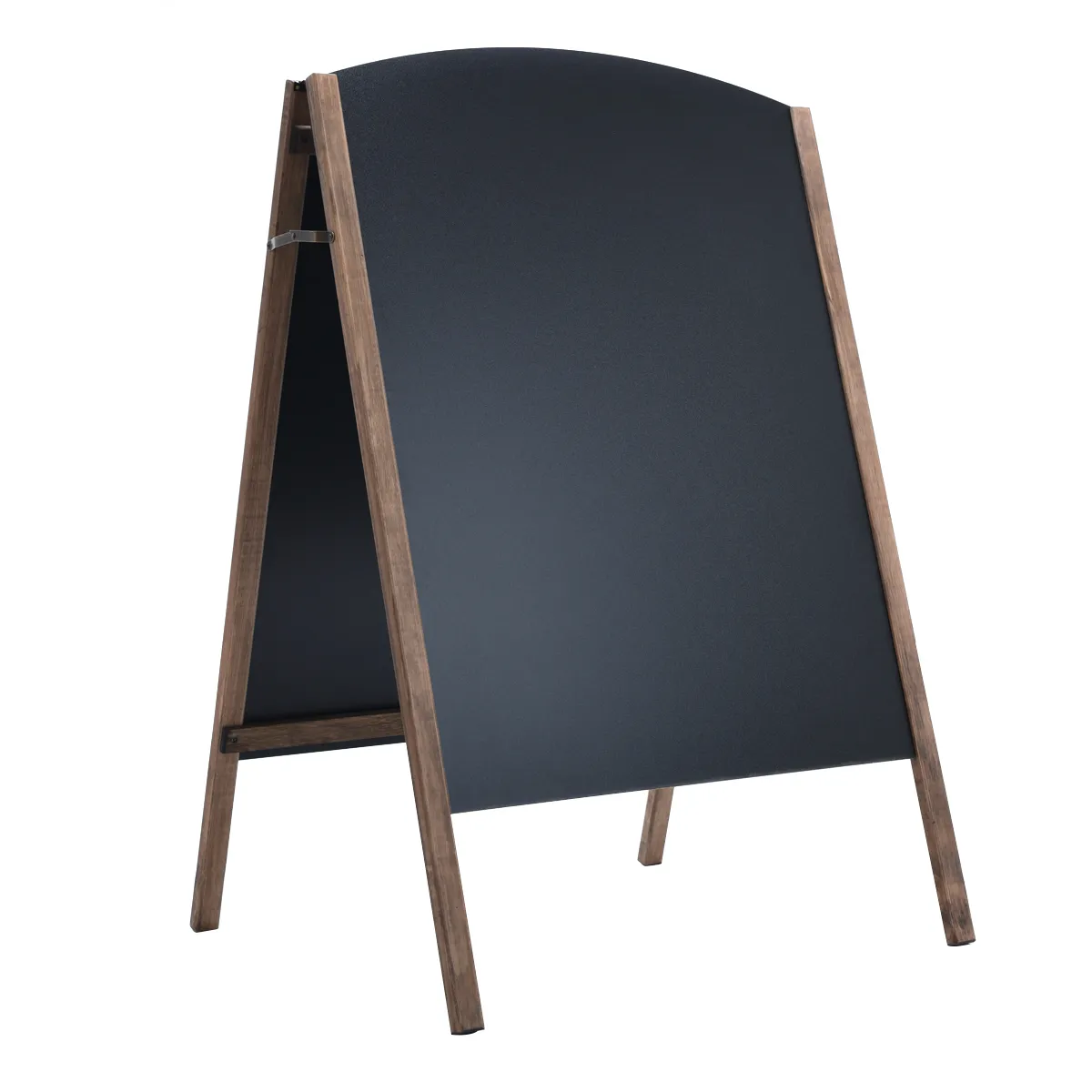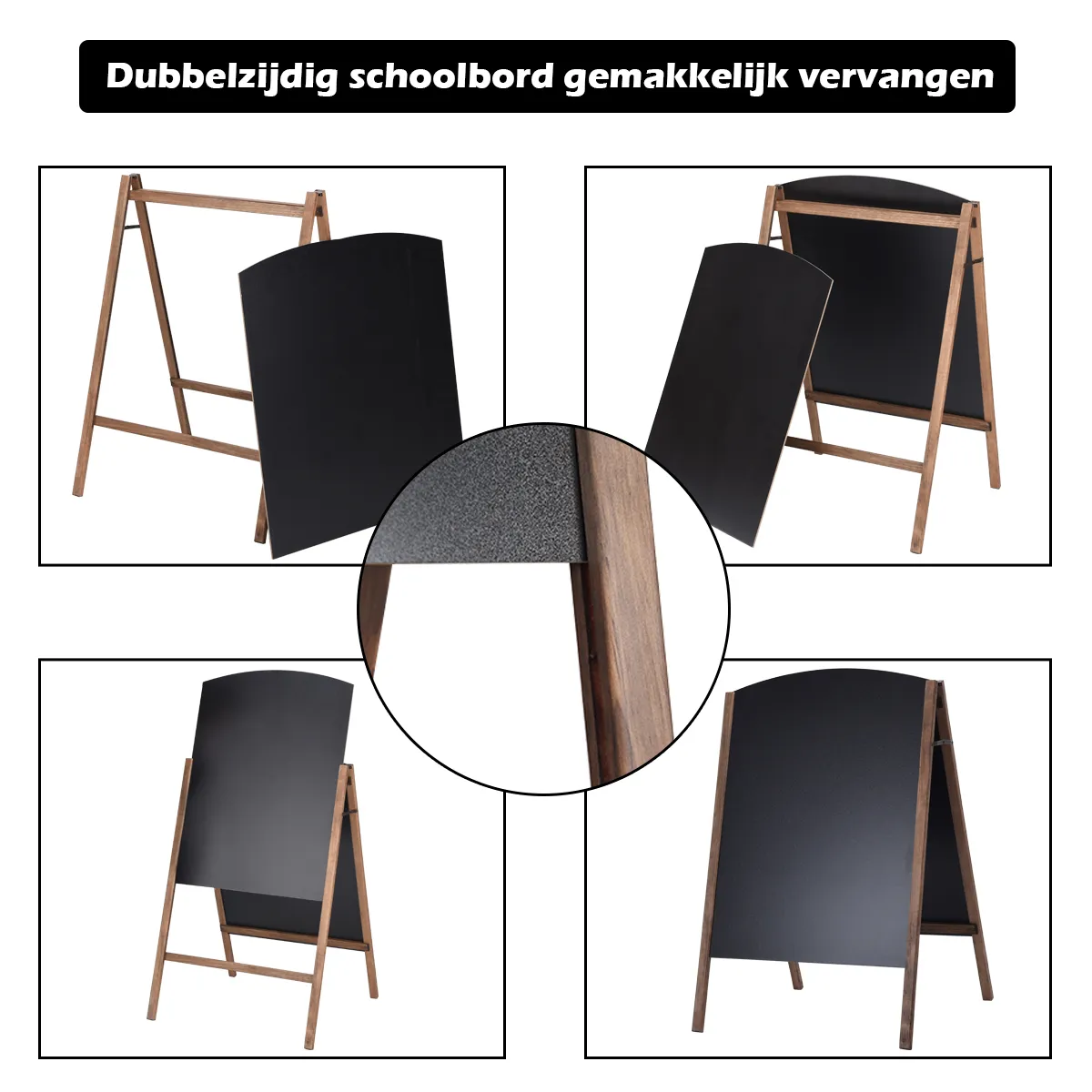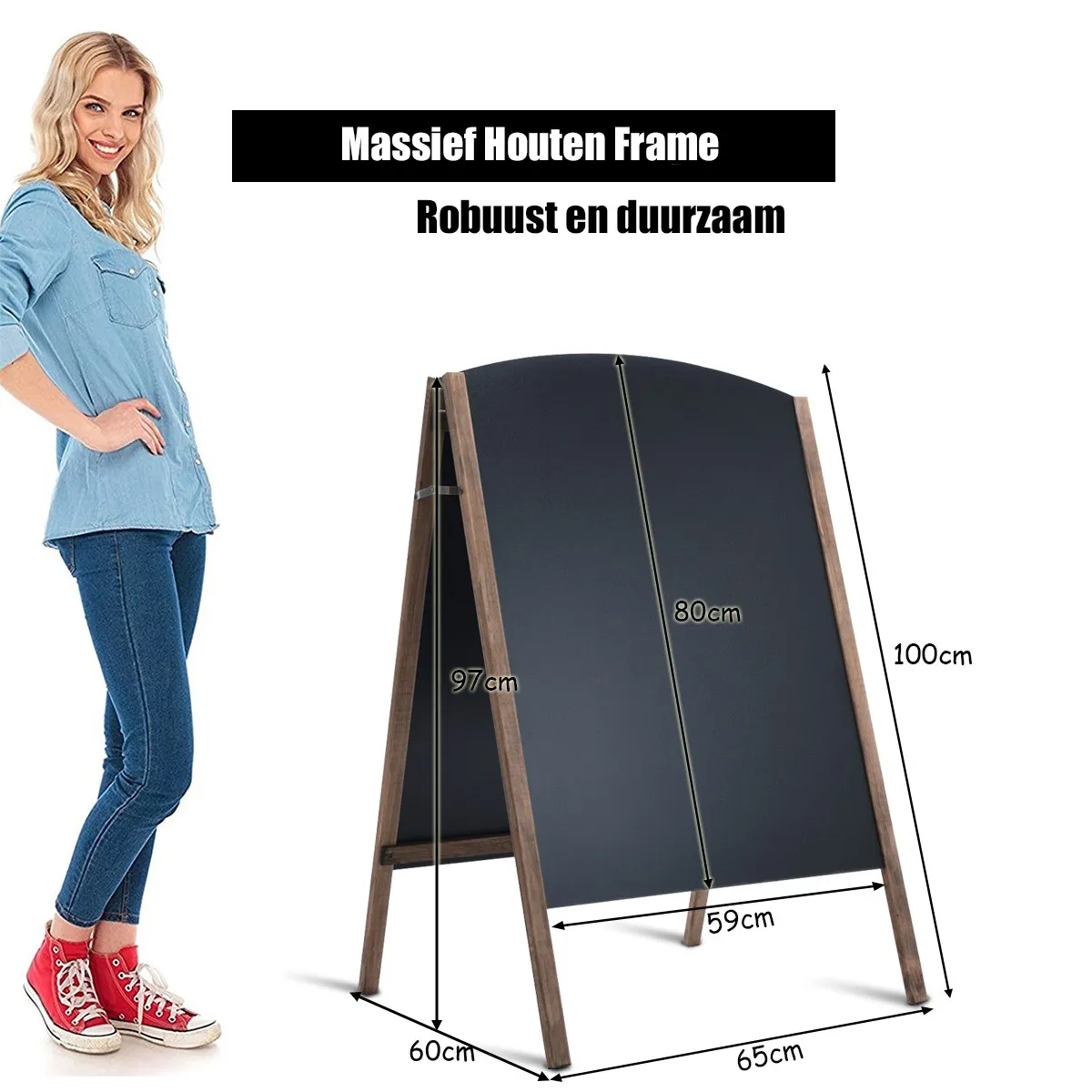 Ons dubbelzijdig A-frame stoepbord is geschikt voor zowel binnen- als buitengebruik. Het is ideaal voor het weergeven van een menu of het afleveren van reclameboodschappen in uw winkel, kroeg of café. Dankzij de hoogwaardige afwerking is het oppervlak zeer robuust, slijtvast en eenvoudig te reinigen. Bovendien zijn twee panelen verbonden met scharnieren, wat zeer stabiel is en snel kan worden opgevouwen.