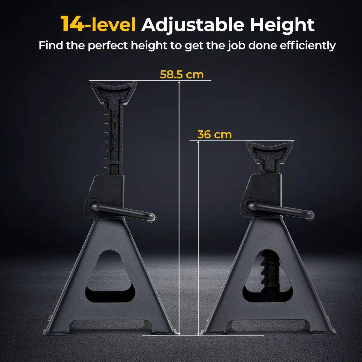 【Verstelbare hoogte】: Deze krikken bieden een veelzijdig verstelbaar hoogtebereik van 36 tot 58,5 cm, zodat je je auto op het perfecte niveau kunt tillen voor elke reparatie of onderhoudstaak.