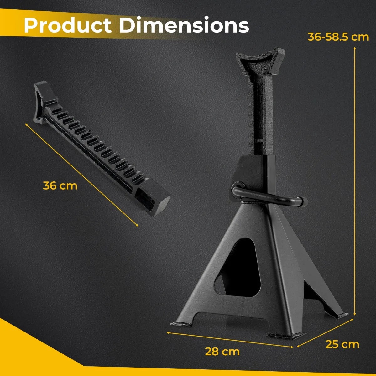 - Afmetingen van elke krik standaard: 28 x 25 x 36-58,5 cm (l x b x h)