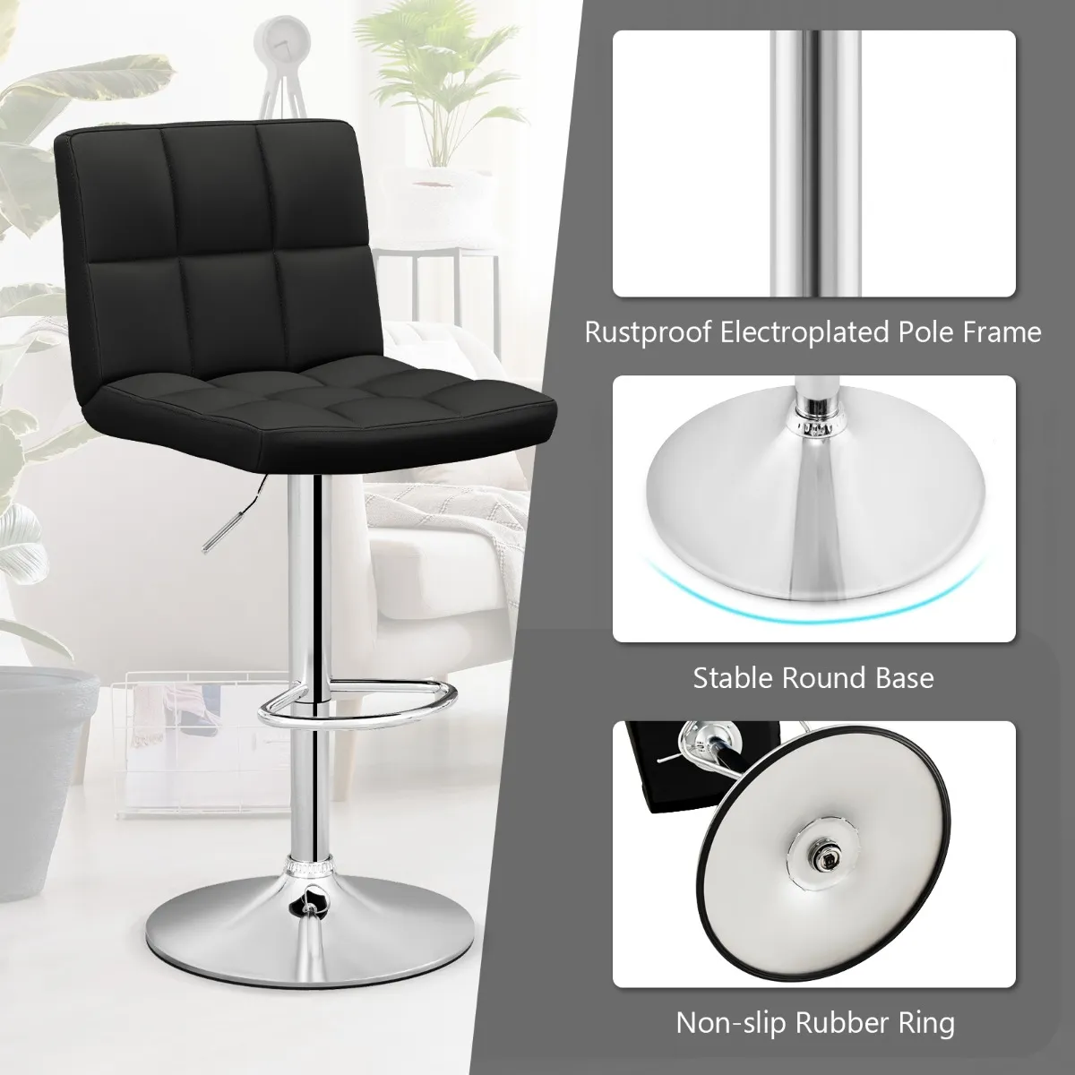 Comfortabele ondersteuning: Elke barstoel heeft een schuine rugleuning en een gevoerde zitting die optimale lenden- en heupsteun bieden. Ook het vermelden waard is een extra voetsteun die de druk op uw benen vermindert, waardoor u optimaal comfort krijgt bij langdurig zitten.