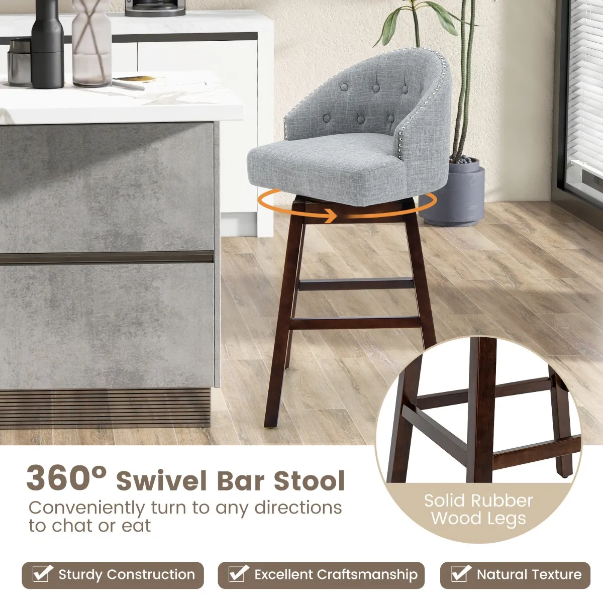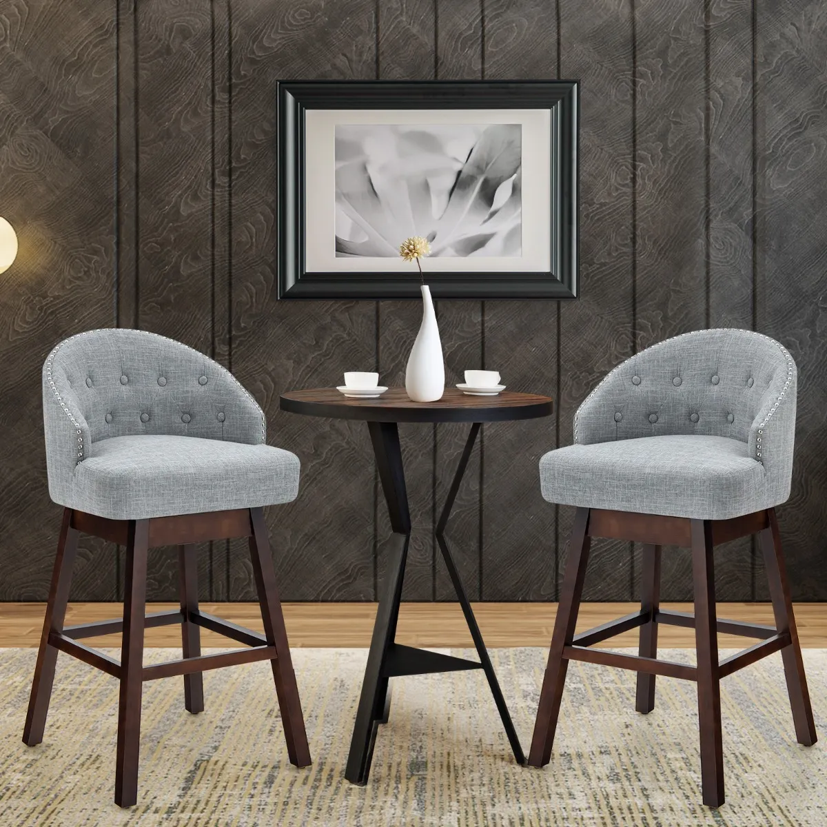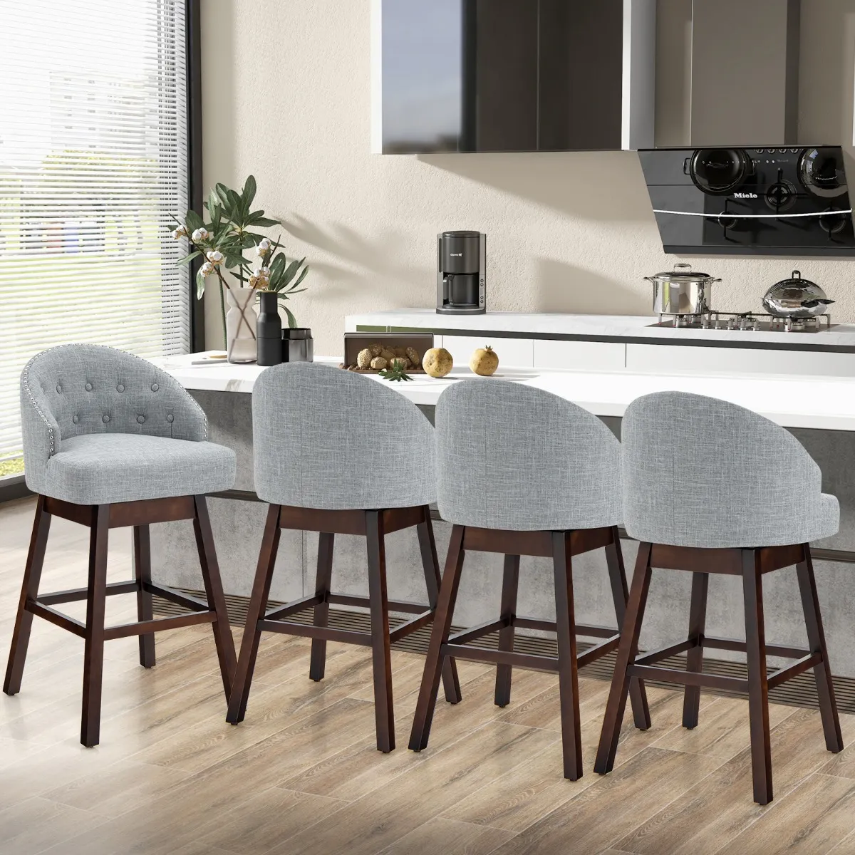 Onze barstoelen met een elegant getuft design, unieke klinknageldecoratie en vloeiende lijnen passen perfect in de keuken, woonkamer of bar. Ze zijn geschikt voor balies van 101 tot 110 cm. Ze zijn 360° draaibaar en zorgen voor meer gemak. De gebogen rug, het zachte kussen en de voetensteun ondersteunen je rug, heupen en voeten. Sponsvulling en ademende linnen stoffen bekleding zorgen voor een comfortabel zitgevoel en eenvoudig onderhoud. De rubberhouten poten en verstelbare glijders garanderen een uitstekende stabiliteit.