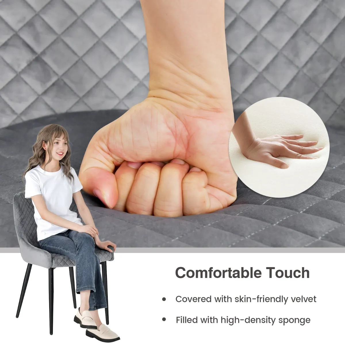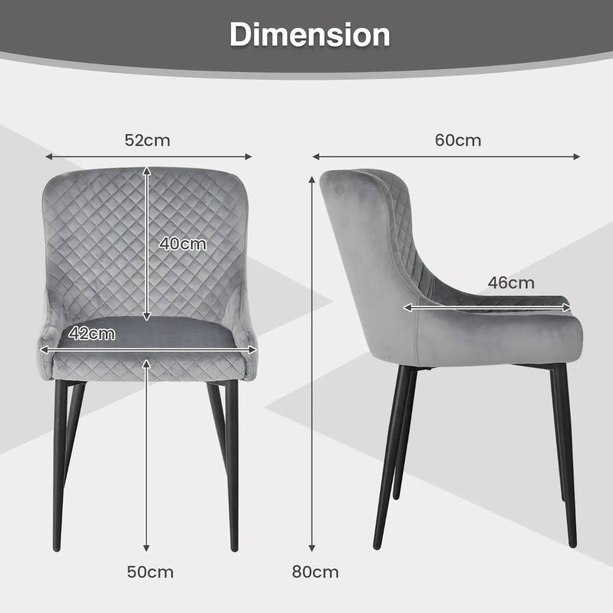 Deze 2 comfortabele eetkamerstoelen hebben een goed ontworpen rugleuning en een gewatteerde zitting gevuld met spons en bedekt met fluweel voor perfect comfort. Om het hele frame te stabiliseren heeft elke stoel 4 stevige, gepoedercoate metalen poten die tot 150 kg kunnen dragen. Er zijn ook verstelbare voetsteunen ontworpen voor extra stabiliteit. Het eenvoudige maar verfijnde ontwerp wordt weergegeven door de strakke lijnen en het rasterpatroon. Deze stoelen vereisen slechts een eenvoudige installatie en zijn geschikt voor keukens, eetkamers en woonkamers.