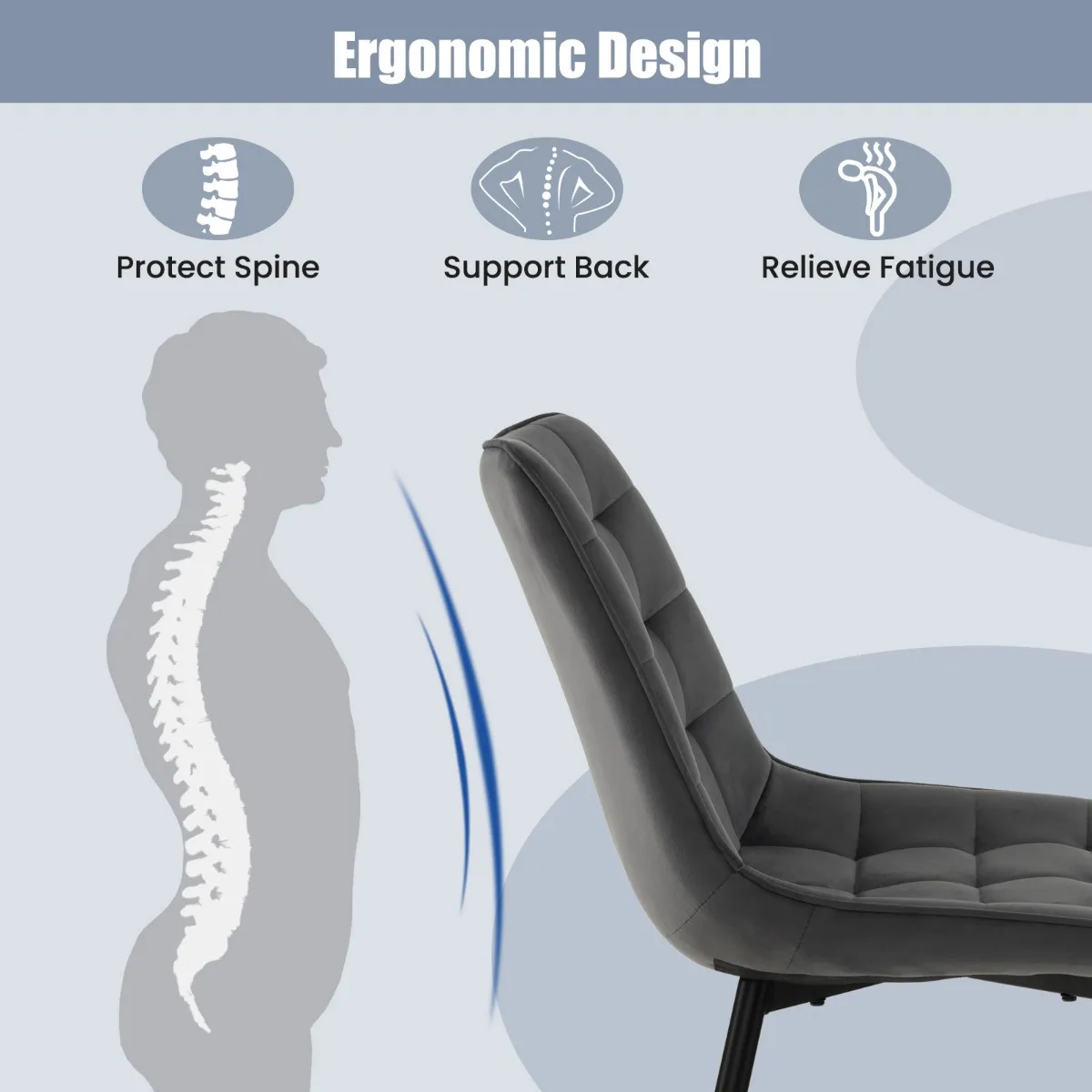 Wil je accentstoelen vinden die je kamer versieren en een gezellige hoek bieden? Mis onze fluwelen eetkamerstoelen in een verpakking van 2 stuks niet. Dankzij de prachtige roosterdecoratie en de grijze kleur zijn deze stoelen geschikt voor verschillende plaatsen, waaronder eetkamer, keuken of woonkamer. De rugleuningen en stoelen zijn uitgerust met een fluweelachtige stoffen bekleding en een hoogwaardige schuimvulling en voelen aangenaam aan. Dankzij de afgeschuinde rugleuning kun je op onze stoelen bovendien heel comfortabel achterover leunen. Stabiele metalen poten met antislip voetkussens dragen je lichaamsgewicht goed en voorkomen wiebelen. En elke stoel draagt tot 150 kg.