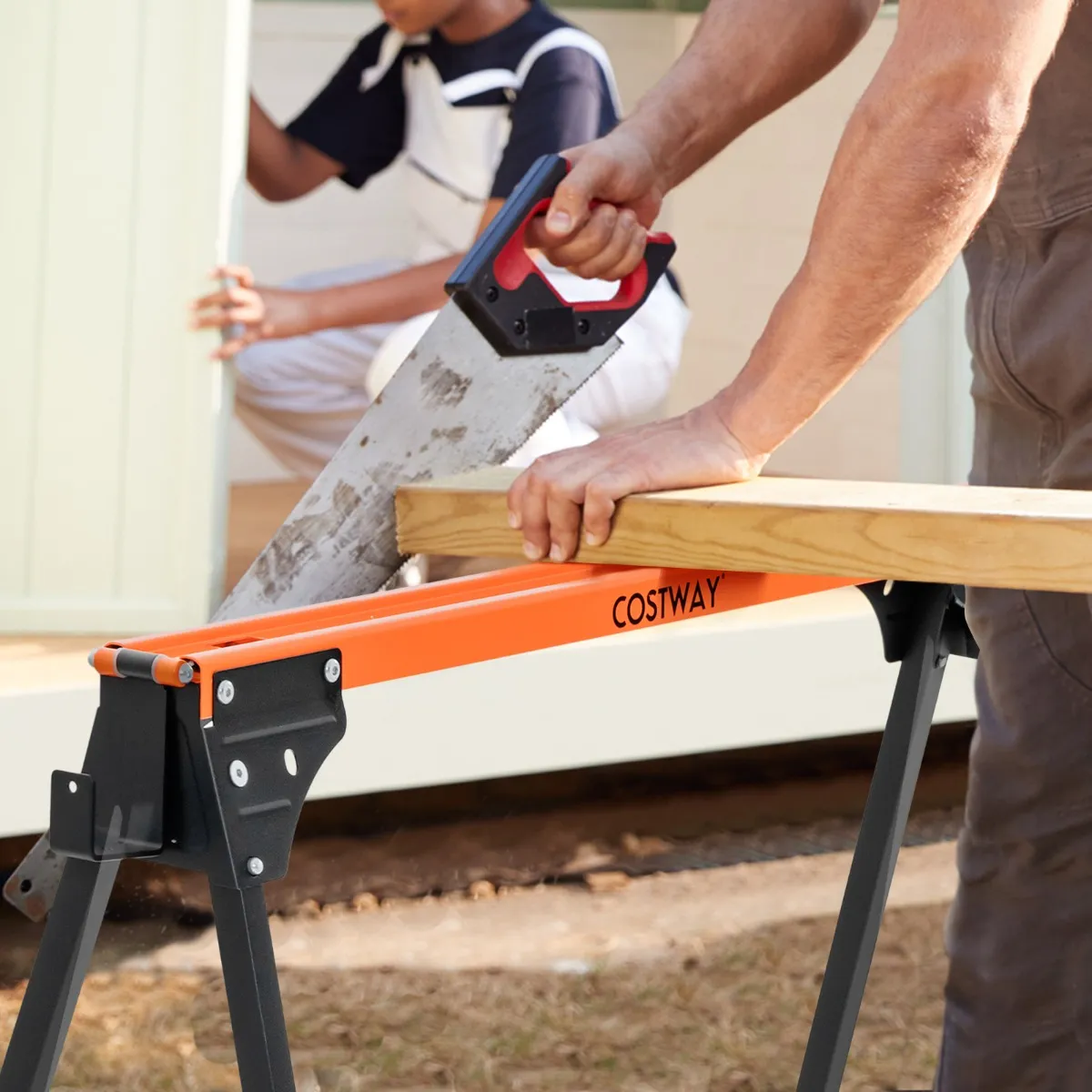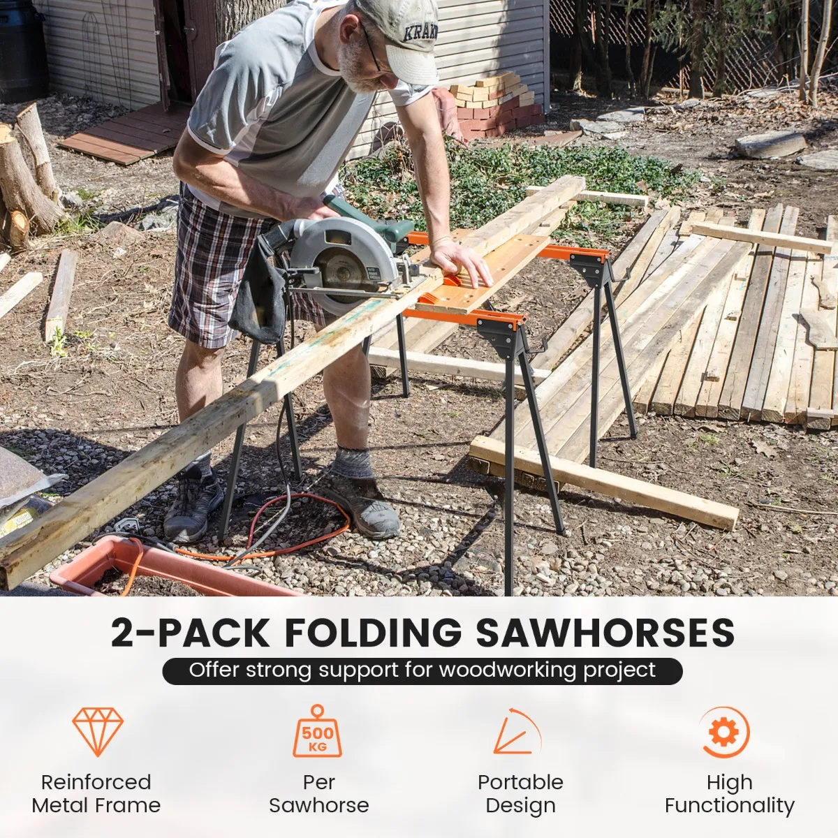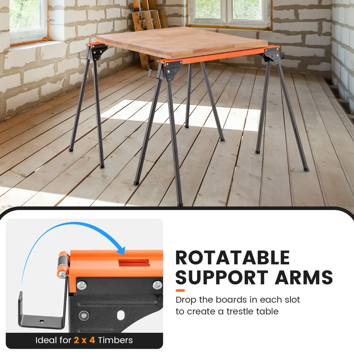 【Roterende steunpoten】 Deze goed ontworpen zaagbokken hebben steunpoten die kunnen worden gedraaid als ze niet worden gebruikt. De steunarmen zijn ideaal voor 2 x 4 hout, zodat je planken in elke sleuf kunt plaatsen om een schragentafel te maken.