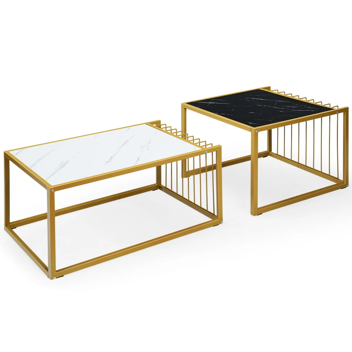 Neem deze nesttafel mee naar huis die een perfect evenwicht biedt tussen esthetische schoonheid en een goede bruikbaarheid. Of hij nu in elkaar genesteld is of gescheiden, hij levert altijd een uniek, eenvoudig en elegant ontwerp om uw huisdecoratie te verfraaien. Het kan worden gebruikt als bijzettafel, eindtafel, banklijst en meer, volgens uw veranderende behoefte in het dagelijks leven. Ondertussen, is het de gemarmerde oppervlakte die de lijstreeks uniek het kijken ontwerp maakt leveren, dat ook meer lichtgewicht dan echte marmeren is. De vierkante vorm van het tafelblad is breed genoeg om verschillende soorten punten aan te passen. Andere kenmerken, zoals een stevige metalen structuur, een stevige verbinding en een eenvoudige montage, liggen voor u klaar om te ontdekken.