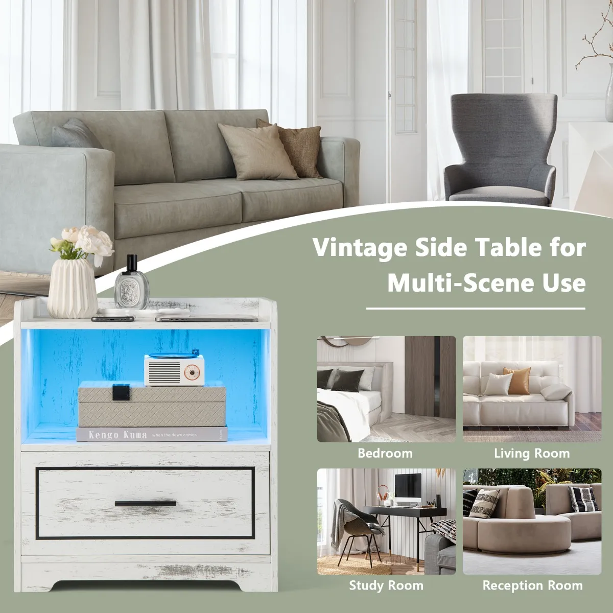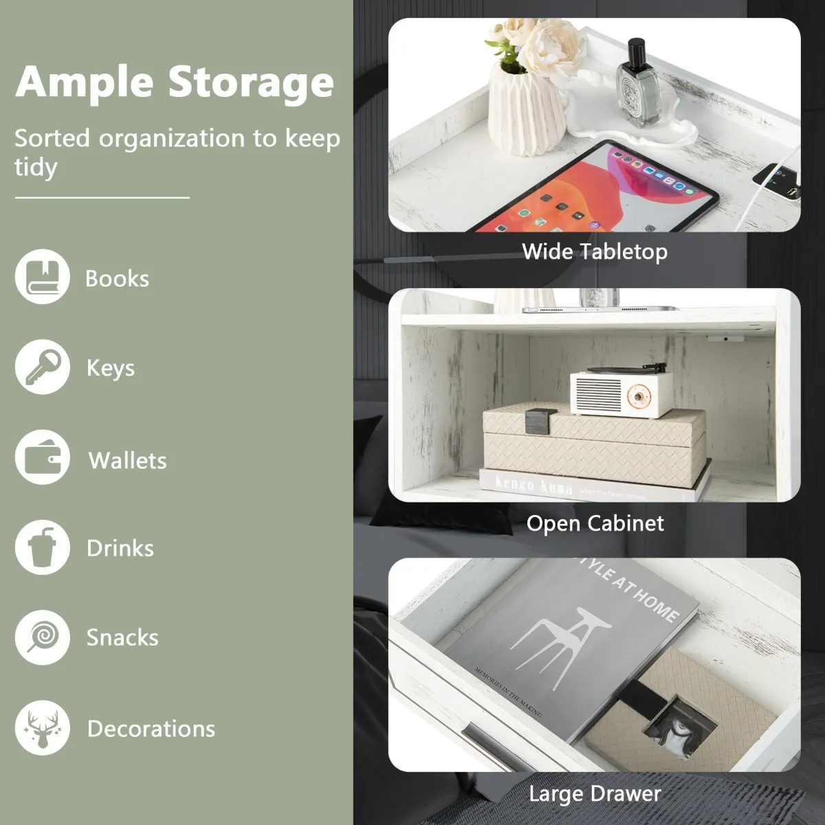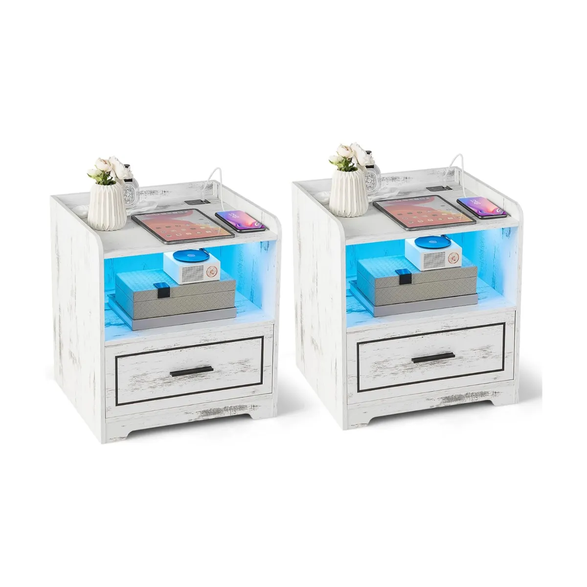 Dit nachtkastje met ledverlichting brengt enkele moderne aspecten in je slaapkamer die je leven sterk vereenvoudigen. Hij biedt veel opbergruimte met een breed tafelblad, een open plank en een lade. Vooral het tafelblad heeft een verhoogde rand om voorwerpen op hun plaats te houden. Het open rek is uitgerust met ledlampen, waarvan de lichtkleur in 3 standen kan worden ingesteld en waarvan de lichtdichtheid ook aanpasbaar is. Als personen de sensor binnen 1 m naderen, worden de lichten automatisch ingeschakeld. Als er 30 seconden lang niemand in de buurt van de sensor zit, wordt het licht uitgeschakeld. Bovendien is er een USB-poort en een type C-aansluiting voor het eenvoudig opladen van mobiele telefoons of elektronische apparaten. Over het algemeen is het nachtkastje een klassieke, maar praktische aanvulling, die slechts een eenvoudige installatie vereist.
