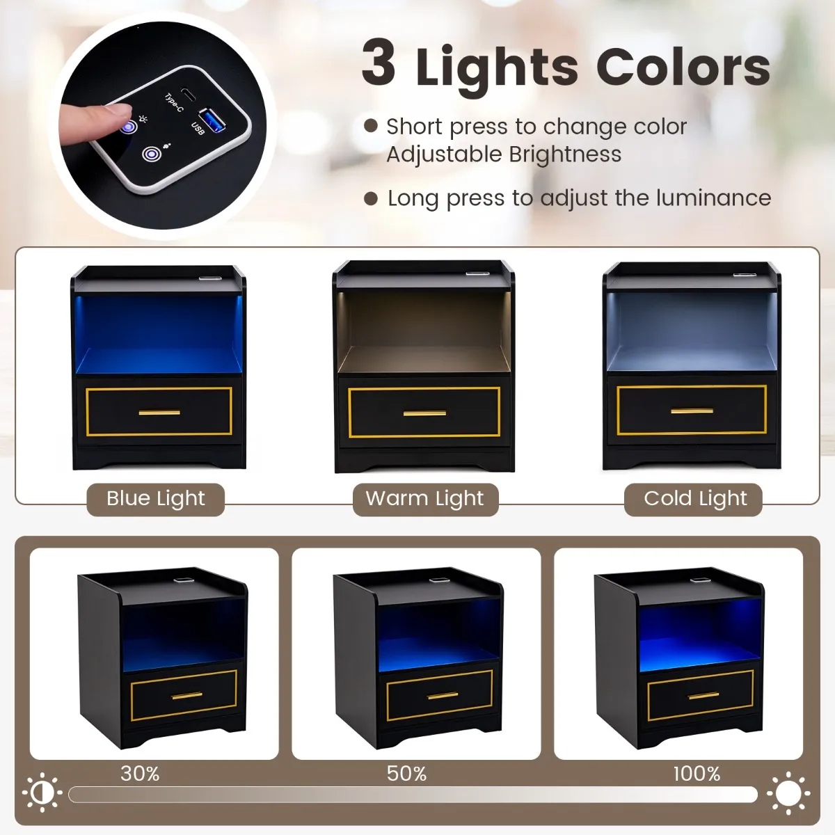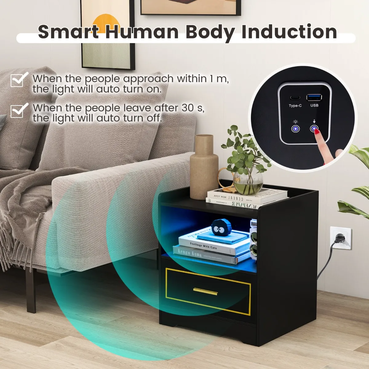 Dit nachtkastje met ledverlichting brengt enkele moderne aspecten in je slaapkamer die je leven sterk vereenvoudigen. Hij biedt veel opbergruimte met een breed tafelblad, een open plank en een lade. Vooral het tafelblad heeft een verhoogde rand om voorwerpen op hun plaats te houden. Het open rek is uitgerust met ledlampen, waarvan de lichtkleur in 3 standen kan worden ingesteld en waarvan de lichtdichtheid ook aanpasbaar is. Als personen de sensor binnen 1 m naderen, worden de lichten automatisch ingeschakeld. Als er 30 seconden lang niemand in de buurt van de sensor zit, wordt het licht uitgeschakeld. Bovendien is er een USB-poort en een type C-aansluiting voor het eenvoudig opladen van mobiele telefoons of elektronische apparaten. Over het algemeen is het nachtkastje een klassieke, maar praktische aanvulling, die slechts een eenvoudige installatie vereist.