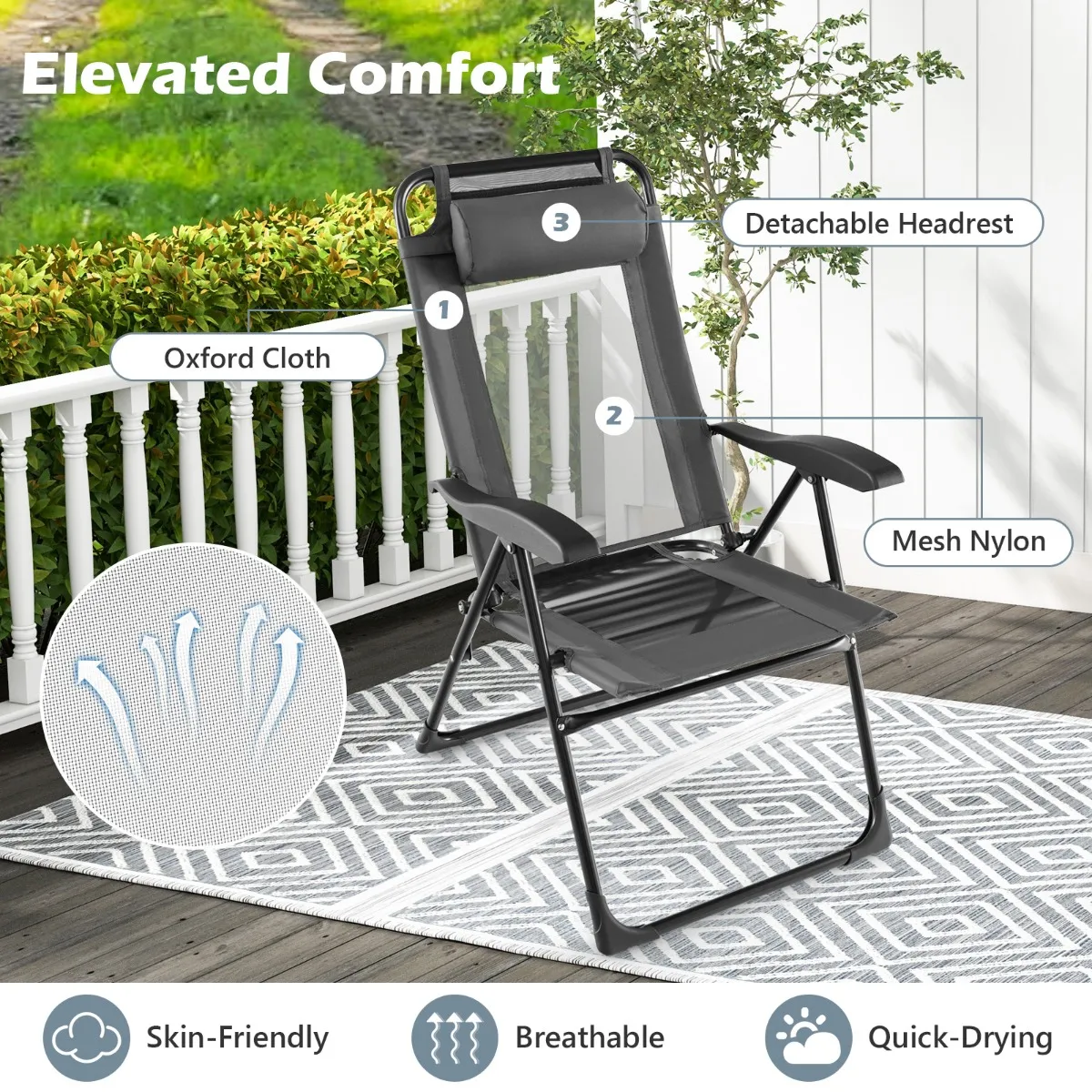 Deze 2 opvouwbare terrasstoelen zijn ontworpen met een grote zitting in weerbestendige Oxford stof en ademend nylon gaas, en brede armleuningen voor optimaal zitcomfort. Met 7 verstelbare rugleuningstanden kun je lezen, zonnen of zelfs slapen. Ze zijn gebouwd met een stevig, stabiel metalen frame dat roestbestendig is. Als ze niet worden gebruikt, kunnen ze gemakkelijk worden opgevouwen tot een compact formaat, waardoor ze gemakkelijk kunnen worden opgeborgen. Ze zijn perfect voor verschillende buitengelegenheden en bieden comfort en gemak.