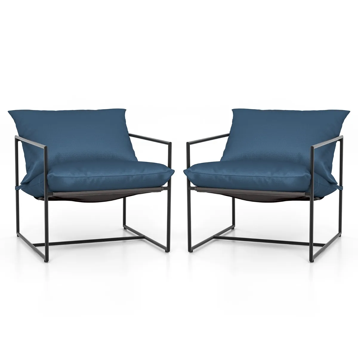 Deze 2 ergonomische vrijetijdsstoelen met een unieke sling zitting verlichten je vermoeidheid. De stof van de zitting is scheurvast, kleurvast, ademend en sneldrogend. Je kunt zitten op de zachte kussens met vulling van hoge dichtheid, die stevig op hun plaats worden gehouden met bevestigingsriemen. Het versterkte metalen frame is roestbestendig en heeft antislip voetsteunen en een stevige dwarsbalk voor extra stabiliteit. Deze stoelen zijn perfect voor binnen en buiten en geven elke ruimte een modern tintje.