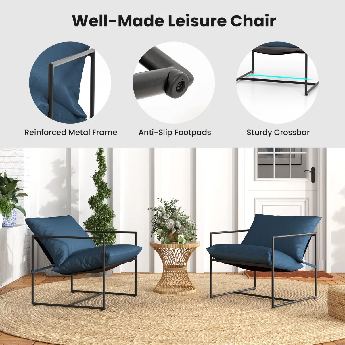 Versterkt metalen frame: Deze vrijetijdsstoelen hebben allebei een stevig metalen frame dat ook roestbestendig is. Bovendien zorgen de anti-slip voetsteunen en de stevige dwarsbalk voor een grote stabiliteit. Elke stoel kan tot 150 kg dragen.