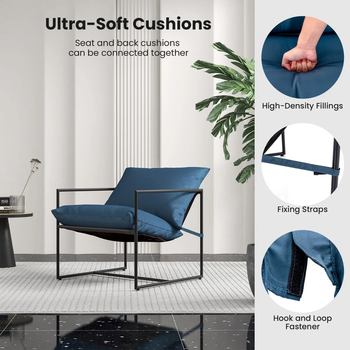 Ultrazachte kussens: De zit- en rugkussens met hoge dichtheid zijn zacht en comfortabel. En de bevestigingsriemen houden de kussens op de juiste plaats. Bovendien kunnen de kussens aan elkaar worden gekoppeld met een klittenbandsluiting.