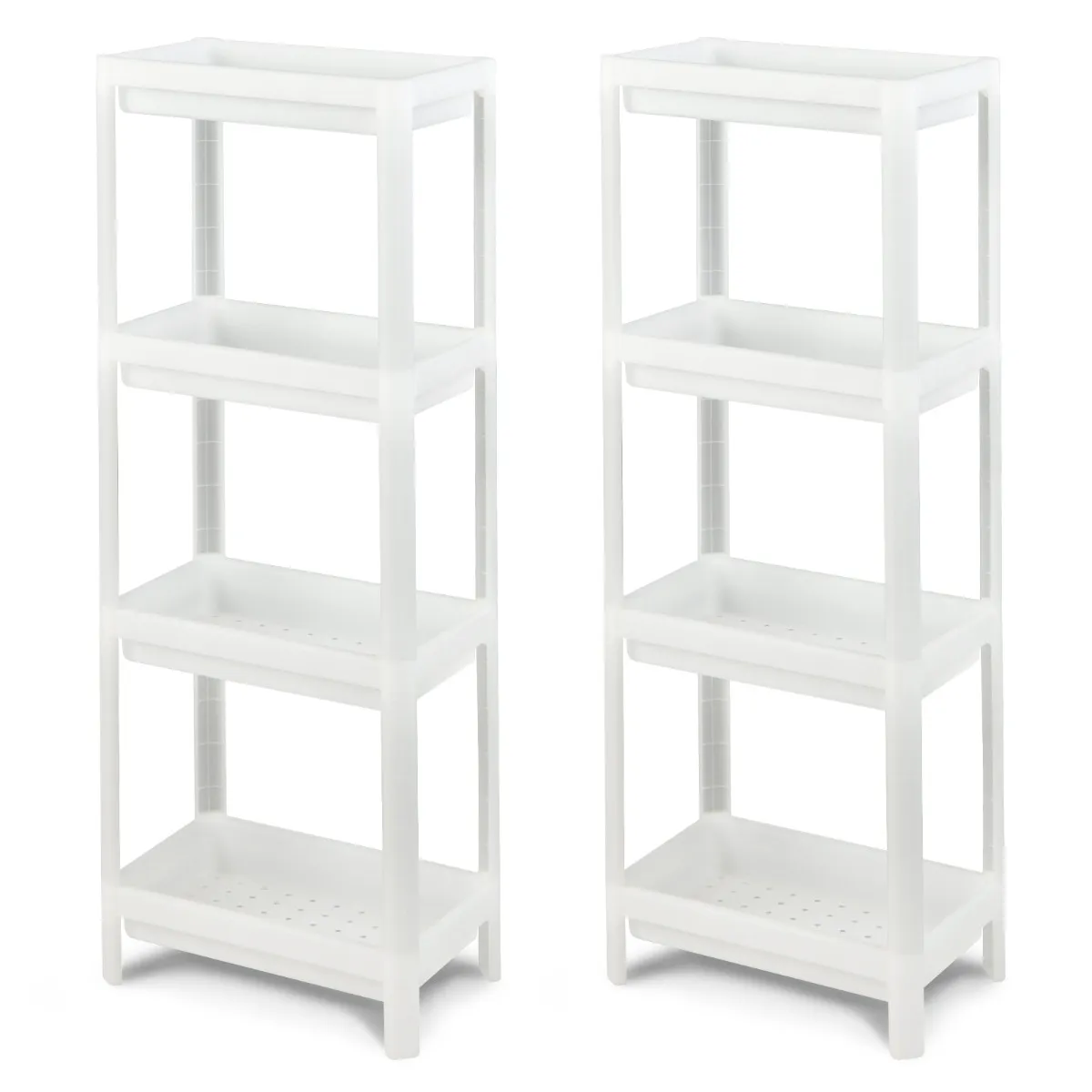 De smalle opbergplank met 4 niveaus kan het gebruik van beperkte ruimte verbeteren. Deze set van 2 legplanken kan worden ingesteld op 2 niveaus of 4 niveaus, afhankelijk van je behoeften. Op de plank met 4 niveaus en de juiste hoogte kunt u items indelen en opbergen. De dicht bij elkaar geplaatste afwateringsgaten op elke plank voorkomen dat er water ophoopt. Bovendien kan het holle ontwerp gemakkelijk worden aangepast aan vochtige omgevingen.