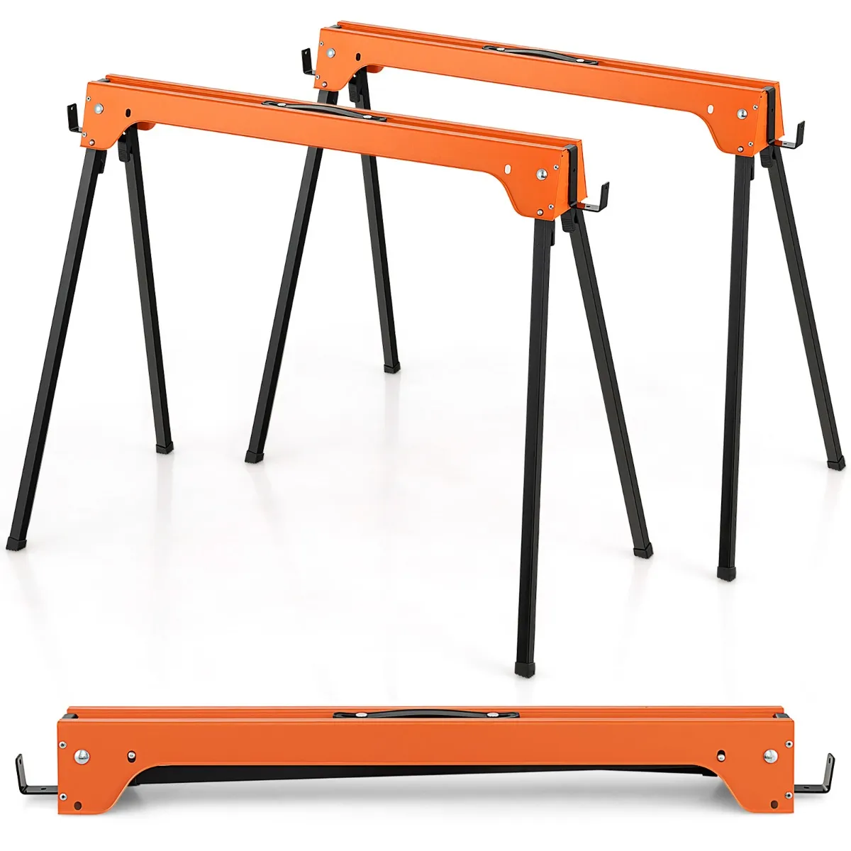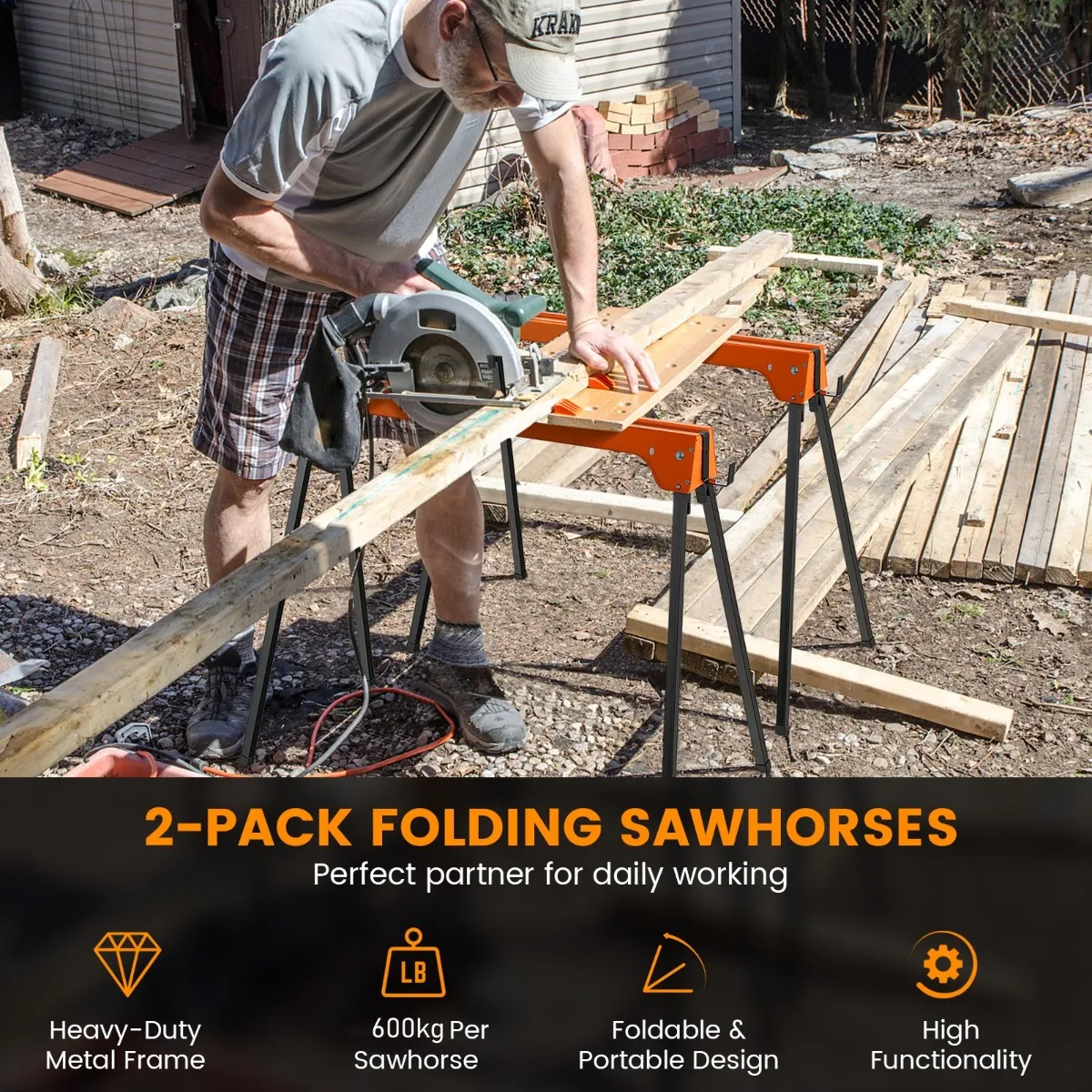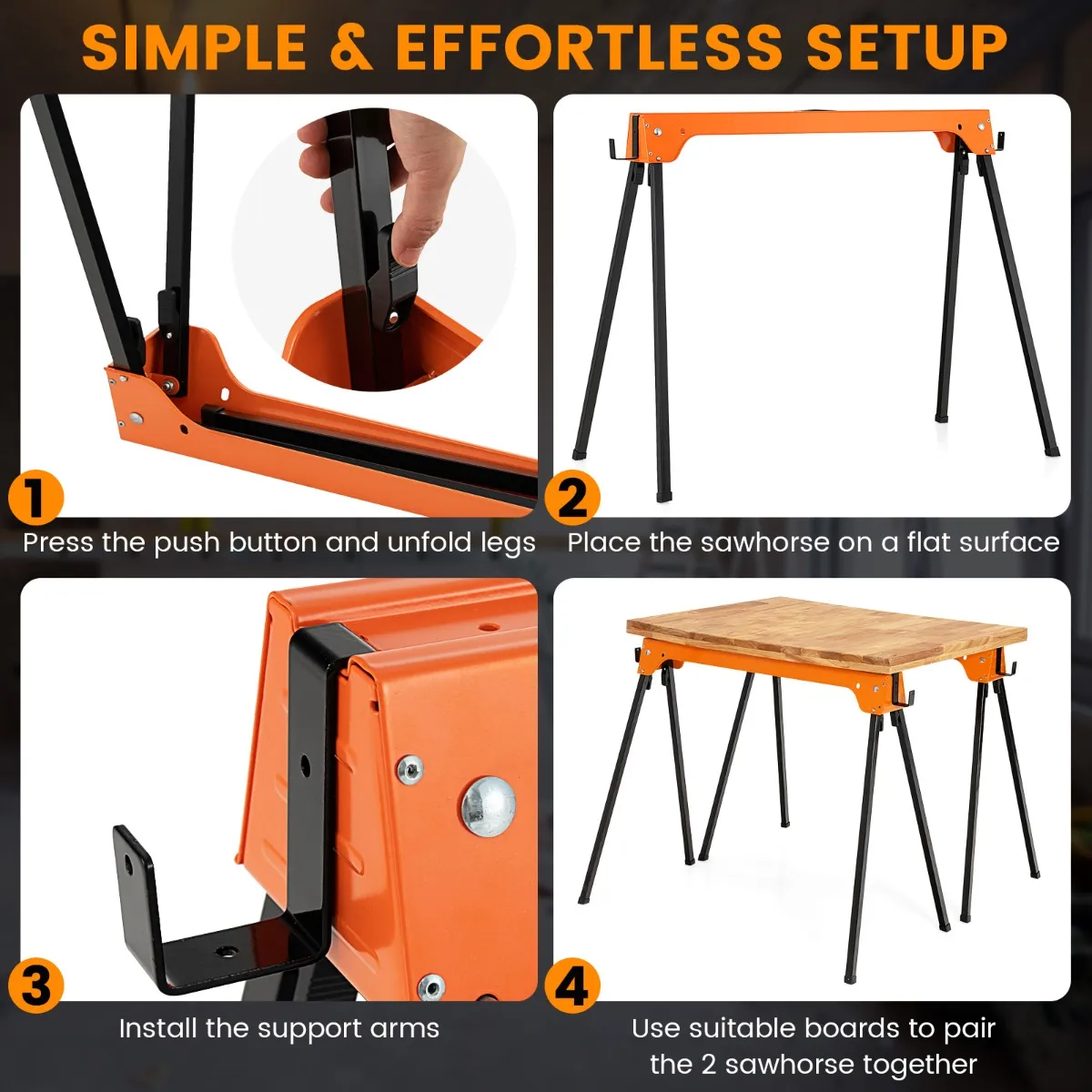 Met een robuust en roestvrij metalen frame is elke zaagbok bestand tegen zwaar gewicht en langdurig gebruik. De antislip voetkussens verbeteren ook de totale stabiliteit aanzienlijk. Bovendien zijn de steunarmen aan de 2 zijden naar behoefte afneembaar. En je kunt de twee zaagblokken samenstellen en een houten plank (niet meegeleverd) erop leggen om ze als werktafel te gebruiken. Afgezien daarvan maken het inklapbare ontwerp en het lage gewicht de zaagblokken eenvoudig te dragen en op te bergen.