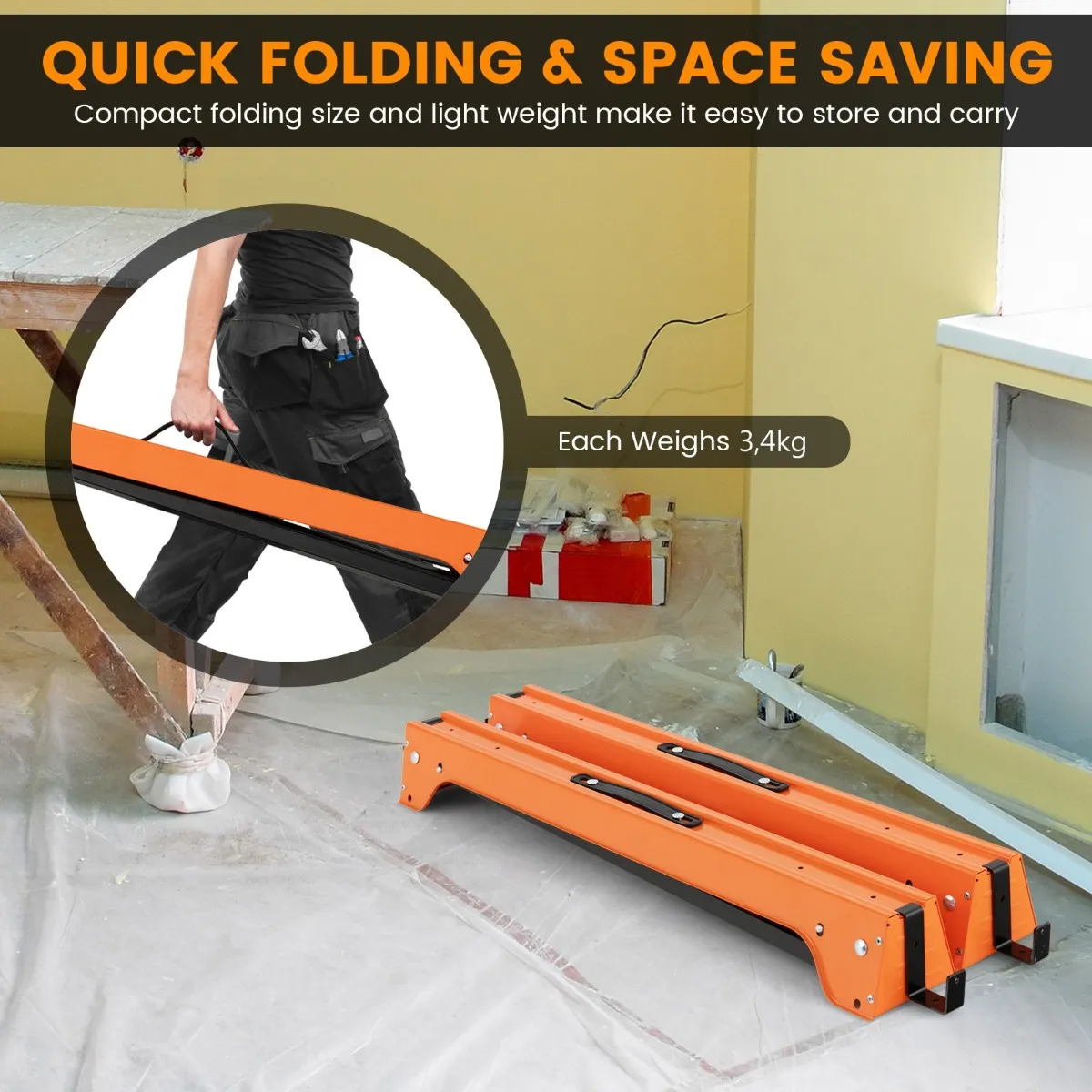 Snel opvouwen en ruimtebesparend: Bij niet-gebruik kunnen de zaagblokken snel tot een compact formaat van slechts 83 x 13 x 10 cm (l x b x h) worden ingeklapt. Zo bespaar je veel ruimte bij het opbergen. Het feit dat elke zaagbok slechts 3,5 kg weegt, maakt moeiteloos dragen mogelijk.