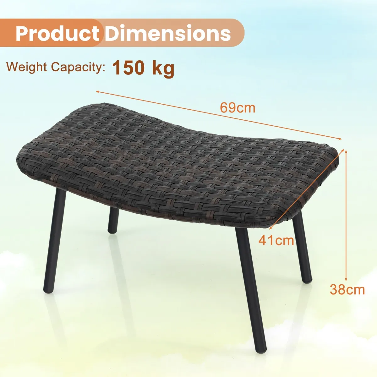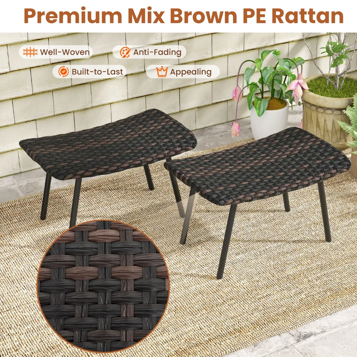 Duurzame rotanmaterialen: Elke poef is gemaakt van hoogwaardig bruin PE-rotan, met duurzaamheid en elegantie. De goed geweven rieten zitting voegt niet alleen een vleugje elegantie toe, maar is ook lichtbestendig en duurzaam.