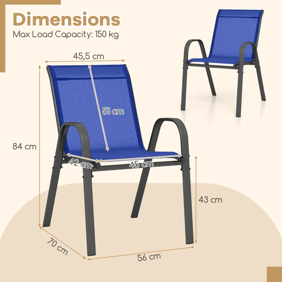 Duurzaam metalen frame:Â De gecoate metalen structuur van elke tuinstoel is voorzien van metalen dwarsbalken en antislipvoetkussens die de stabiliteit vergroten. Met een draagvermogen van 150 kg zorgt dit stevige frame ervoor dat uw stoelen veilig blijven staan.