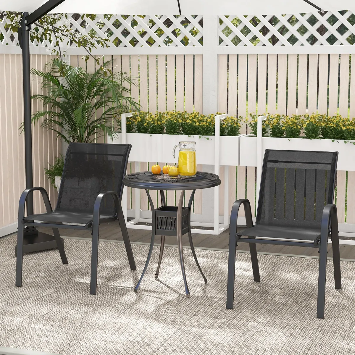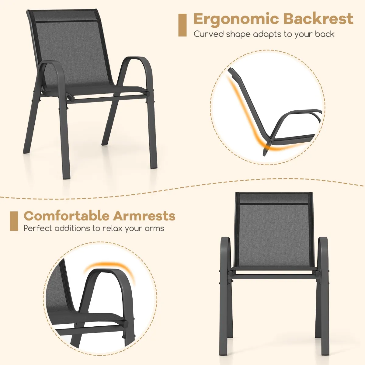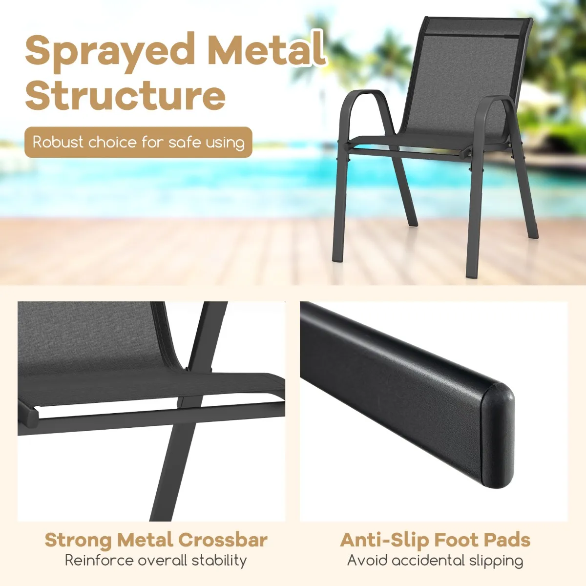 Duurzaam metalen frame:Â De gecoate metalen structuur van elke tuinstoel is voorzien van metalen dwarsbalken en antislipvoetkussens die de stabiliteit vergroten. Met een draagvermogen van 150 kg zorgt dit stevige frame ervoor dat uw stoelen veilig blijven staan.