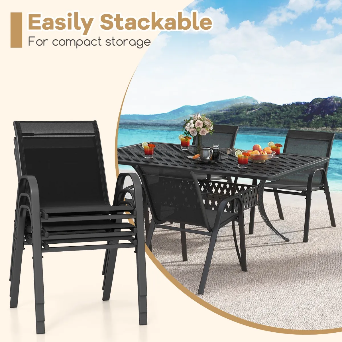 Compacte gestapelde opslag: Nog bedachtzamer: de tuinmeubelset zorgt voor gemakkelijke opslag door de tuinstoelen netjes op te stapelen wanneer ze niet worden gebruikt, om waardevolle ruimte vrij te maken voor andere activiteiten.