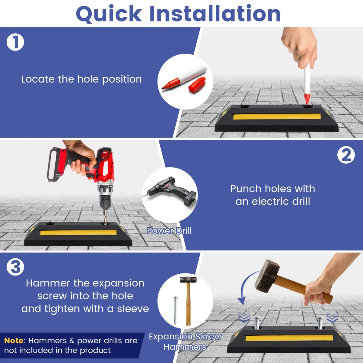 Onze parkeerbumper heeft een verstevigde basis voor maximale stabiliteit. De goed zichtbare reflecterende strip verhoogt de veiligheid in donkere omgevingen, om het risico op ongelukken of schade aan je voertuig te minimaliseren. Hij is ontworpen om intensief gebruik te weerstaan en biedt een uitzonderlijke stabiliteit die zelfs na herhaaldelijk gebruik intact blijft. Je kunt het installeren in garages of privéparkeerplaatsen. Hij is snel en eenvoudig te installeren met expansieschroeven, hamers en elektrische boren.