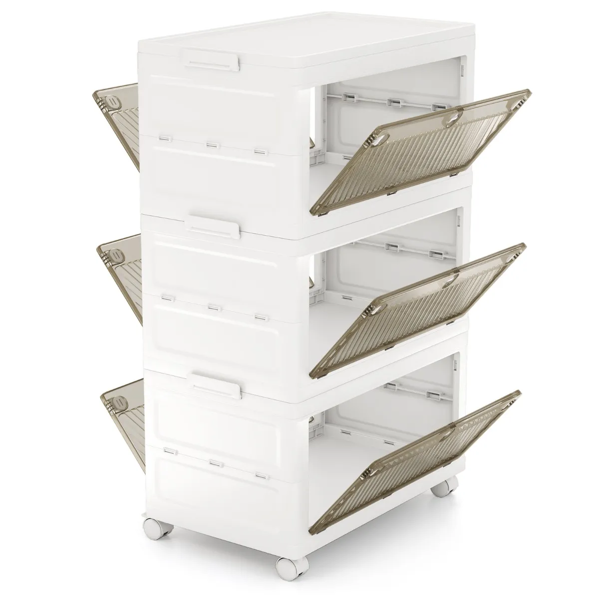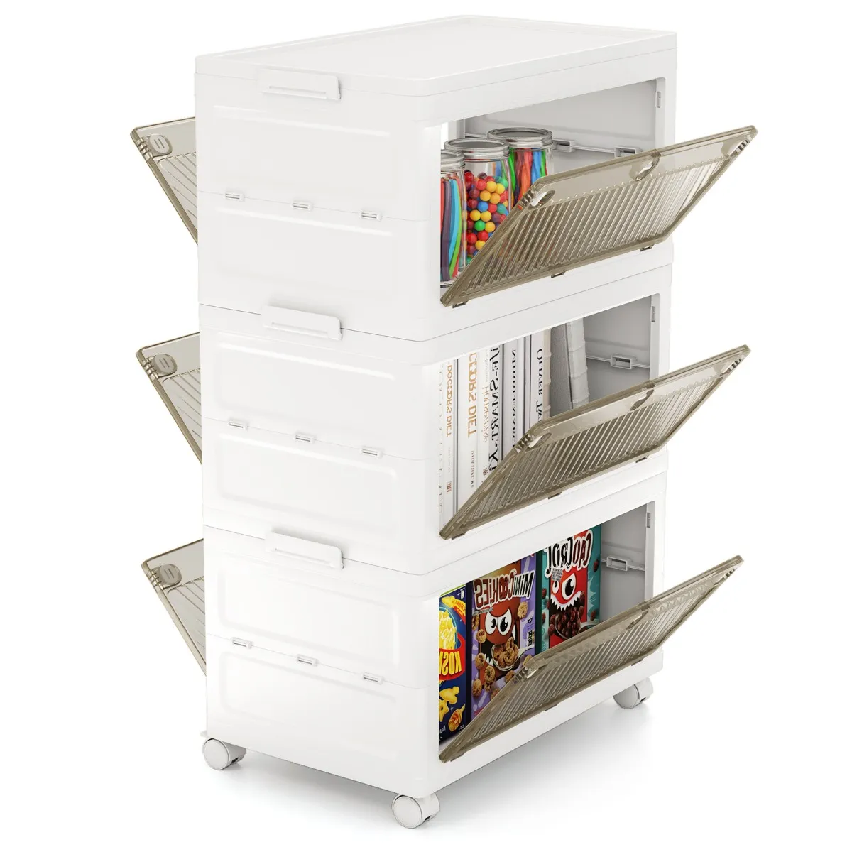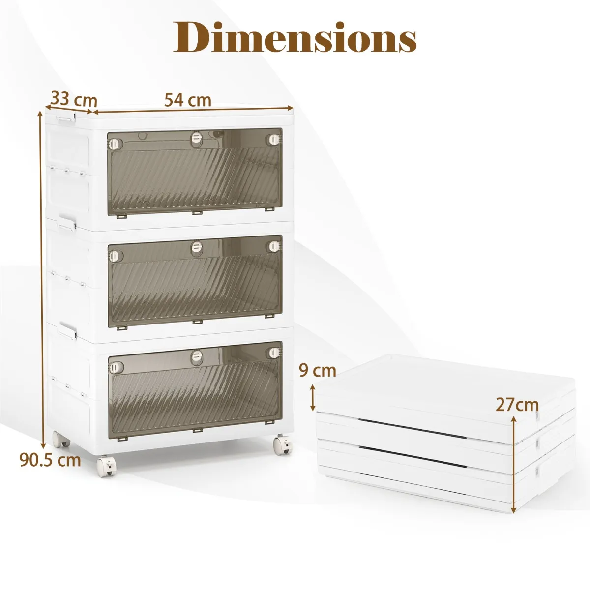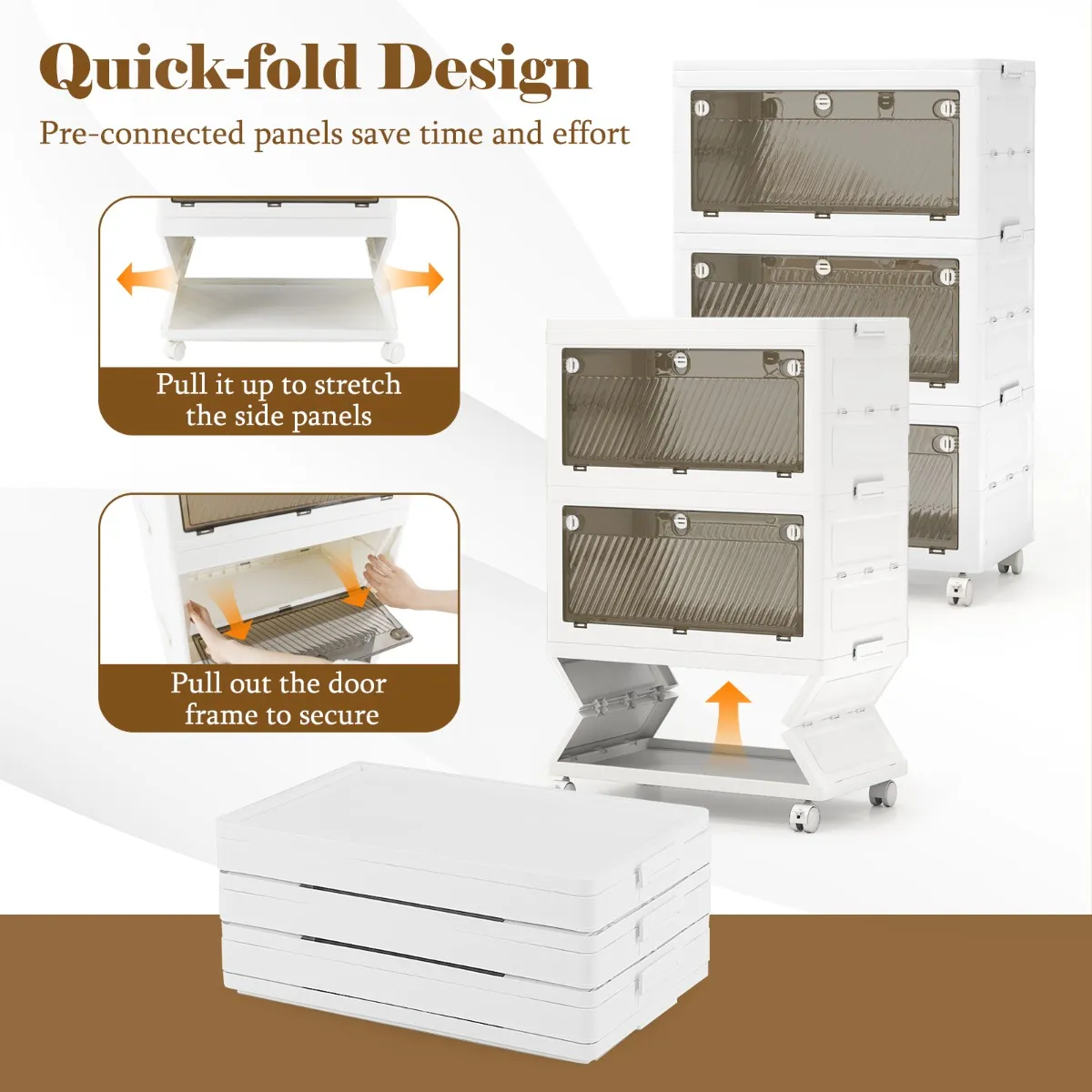 Zeer praktisch zijn onze ruime en snel opvouwbare opbergbakken. Geen rommel meer dankzij het toegankelijke bovendeksel en de dubbele deuren. Dankzij de doorschijnende deuren is de inhoud gemakkelijk te bekijken en te bereiken. Stapel ze op elkaar, klik ze aan elkaar en rol ze overal naartoe met soepele mobiliteit op 4 wielen, waarvan er 2 vergrendeld zijn voor onwrikbare stabiliteit. Ideaal voor huishoudens die op zoek zijn naar organisatie en stijl. Bestel nu uw set en ontdek de ultieme, ruime en mobiele opbergoplossing!