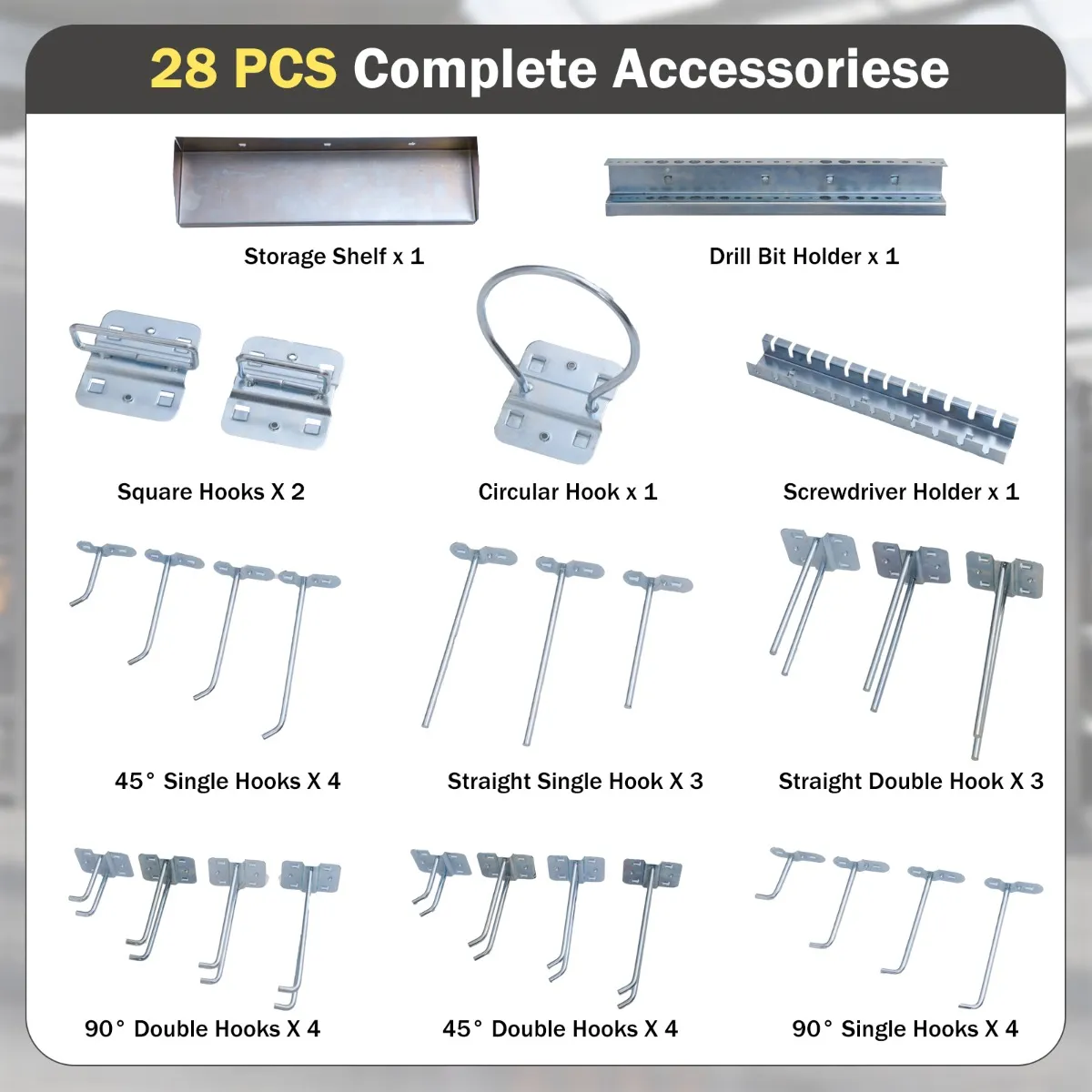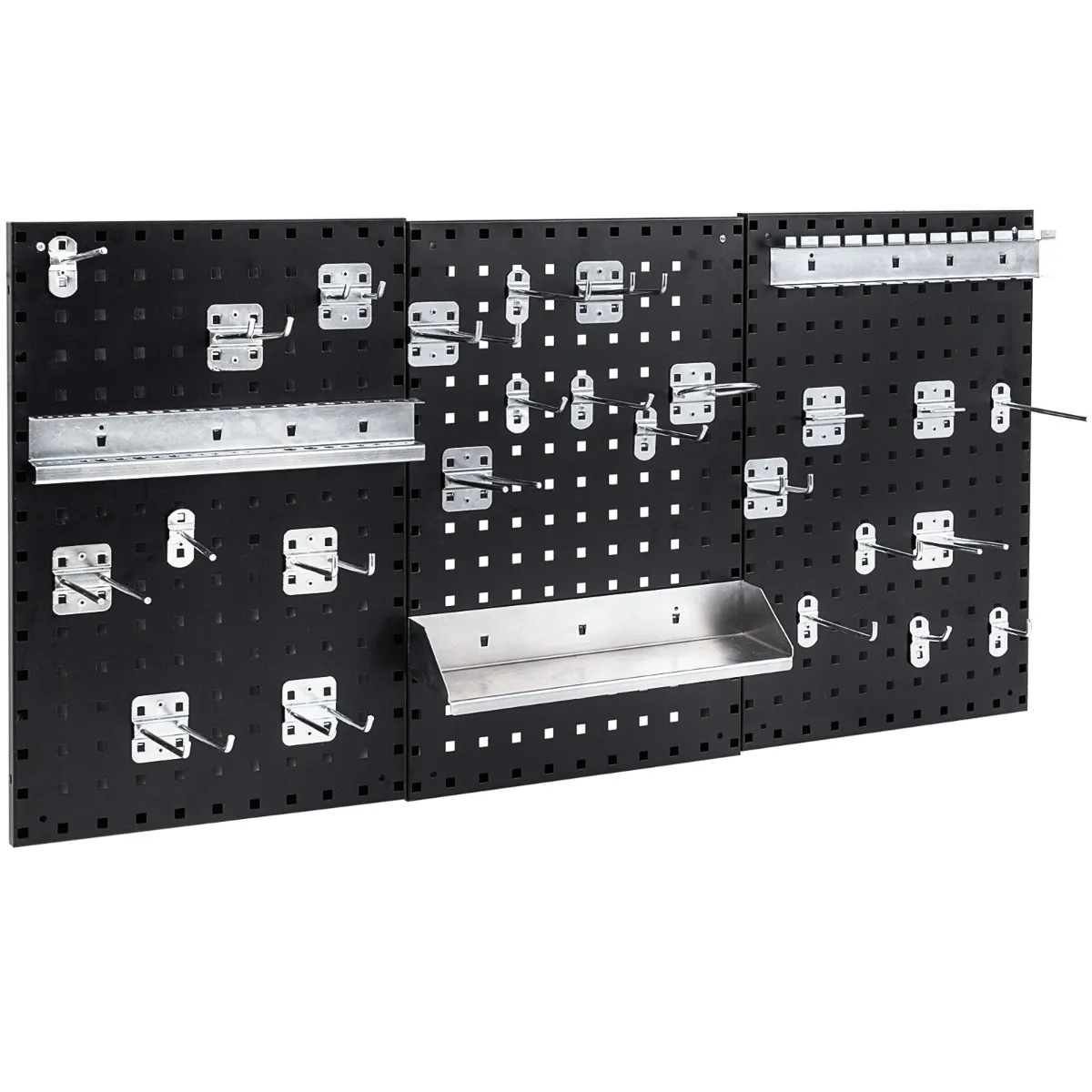 - Inhoud verpakking: 3 x Geperforeerde panelen4 x 90° dubbele haken4 x 45° dubbele haken4 x 90° enkele haken4 x 45° enkele haken3 x Rechte enkele haken3 x Rechte dubbele haken2 x Vierkante haken1 x Ronde haak1 x Schroevendraaierhouder1 x Opbergrek1 x Boorhouder