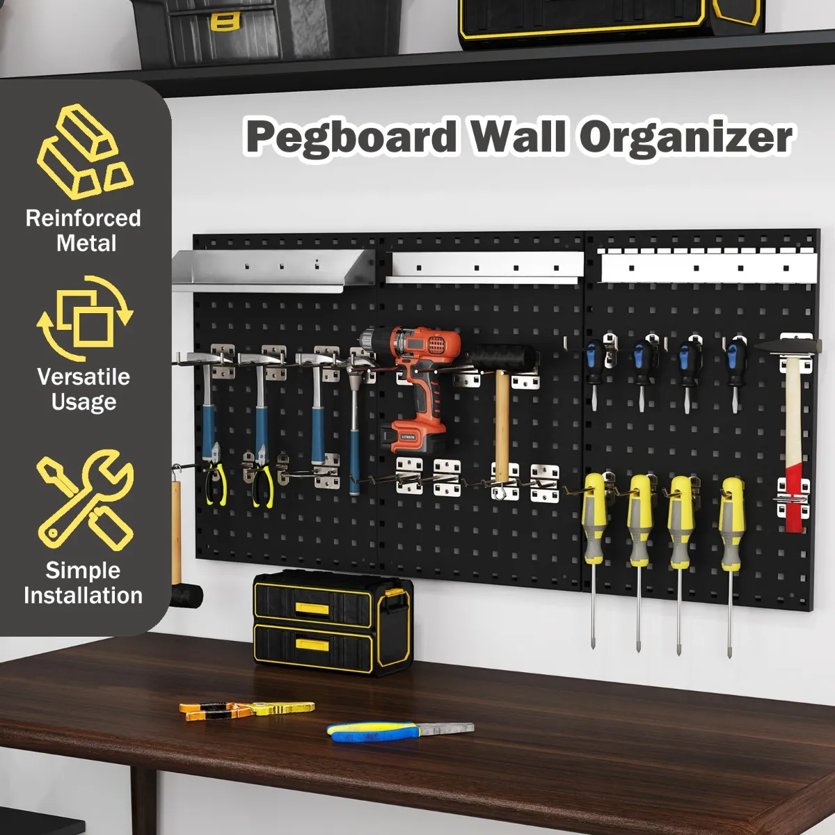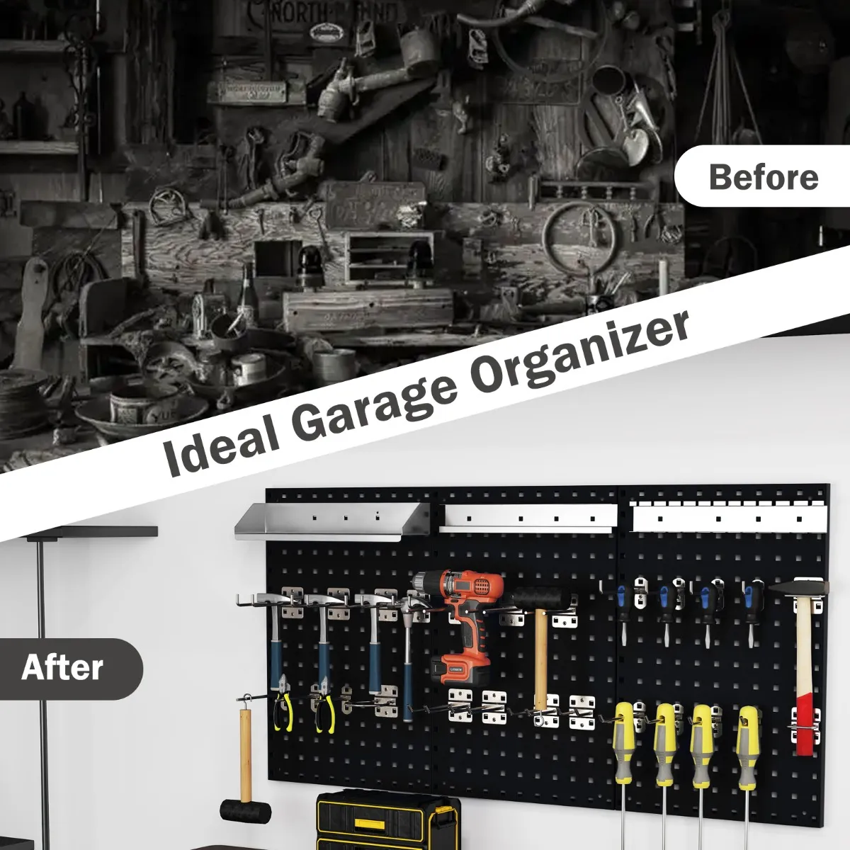 【Ruimtebesparend aan de muur】: Deze wandorganizer met geperforeerde panelen is ontworpen voor wandmontage en optimaliseert je werkruimte door rommel op de vloer of het werkblad te voorkomen, waardoor hij perfect is voor kleine garages of rommelige werkplaatsen.