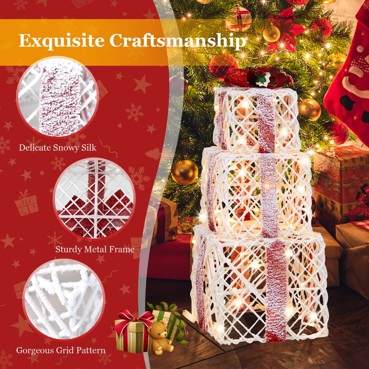 Goed gemaakte geschenkdozen set van 3: De oplichtende kerstcadeauset bevat 3 dozen van verschillende groottes. deze geschenkdozen zijn gemaakt van waterdicht pe en een stevig metalen frame, die duurzaam zijn en kunnen worden gebruikt om verschillende binnen- en buitenplaatsen te versieren. u kunt de geschenkdozen ook naar uw behoeften rangschikken om een ​​bevredigender decoratief effect te bereiken.