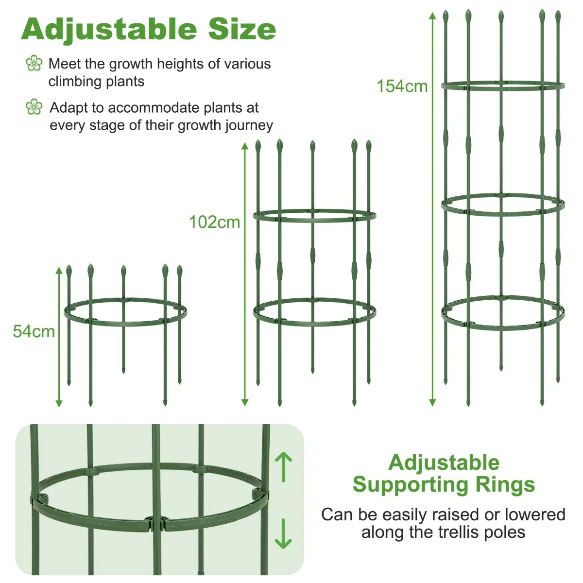【Instelbare afmetingen】: Het 154 cm hoge plantensteunrooster beschikt over 3 hoogteopties: 54 cm/102 cm/154 cm, die voldoen aan de groeihoogtes van verschillende klimplanten en zich aan planten in elke groeifase aanpassen. Naar wens kunnen de roosters ook worden gecombineerd om nog hogere maten te creëren. En de steunringen kunnen langs de latstangen eenvoudig worden opgetild of neergelaten.