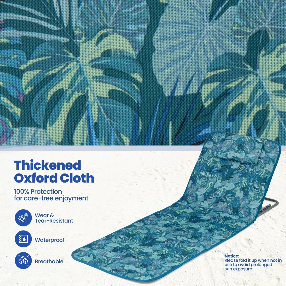 Onze 3-delige opvouwbare mat set kan worden gebruikt voor het strand om te genieten van zonnebaden en bruinen, kamperen om uit te rusten, en achtertuin om te loungen en boeken te lezen op het gras. De strandmat is gemaakt van ademende en weerbestendige oxford stof, die zorgt voor een comfortabele en gezellige ligervaring. Bovendien wordt de strandstoel ondersteund door een sterk aluminium frame dat roestbestendig en duurzaam is, zodat hij lang meegaat. En dankzij het in 5 standen verstelbare vergrendeling systeem kunt u de stoel eenvoudig verstellen voor optimaal ligcomfort. Belangrijker nog, de ligstoelen en tafel kunnen beide in enkele seconden worden opgevouwen voor gemakkelijk transport, en het is gemakkelijk op te bergen wat niet te veel ruimte in beslag zou nemen. Onze 3-delige strandmat set zou uw uitstekende keuze zijn om te ontspannen op het strand, terras, camping, en nog veel meer!